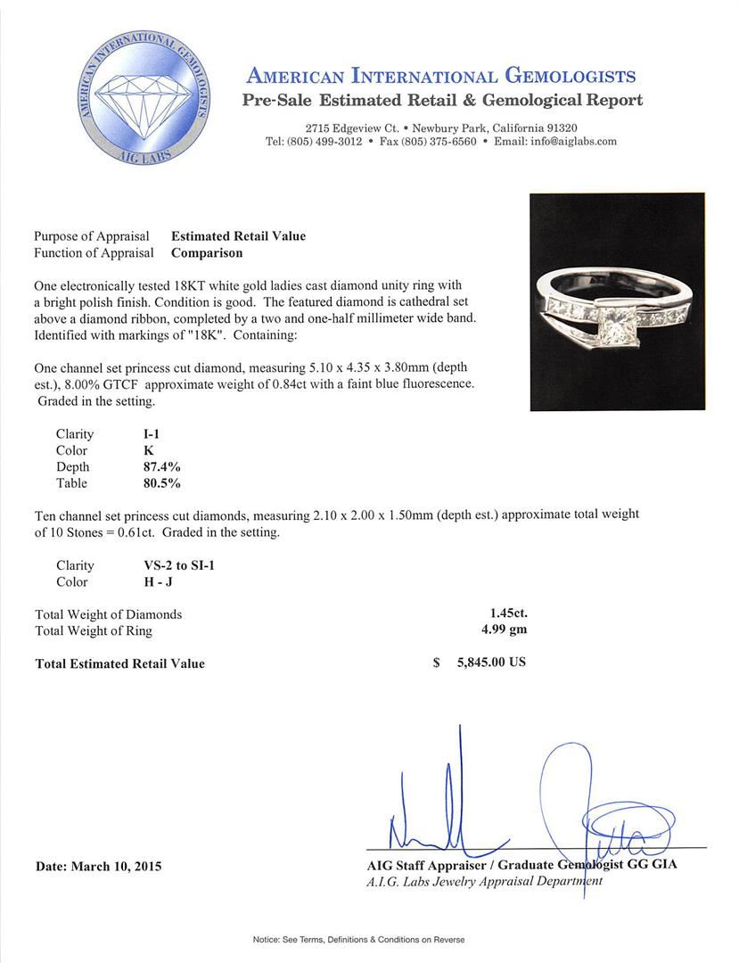 One electronically tested 18KT white gold ladies cast diamond unity ring with a bright polish finish. The featured diamond is cathedral set above a diamond ribbon, completed by a two and one-half millimeter wide band. Identified with markings of "18K". Condition is good. Containing: One channel set princess cut diamond, measuring 5.10 x 4.35 x 3.80mm (depth est.), 8.00.%. GTCF approximate weight of 0.84ct with a faint blue fluorescence. Graded in the setting. Clarity: I-1. Color: K. Depth 87.4%. Table 80.5%. Ten channel set princess cut diamonds, measuring 2.10 x 2.00 x 1.50mm (depth est.) approximate total weight of 10 Stones = 0.61ct. Graded in the setting. Clarity: VS-2 to SI-1. Color: H - J. Total Weight of Diamonds 1.45ct. Total Weight of Ring 4.99 grams. AIG Appraised at $5,845.00.
