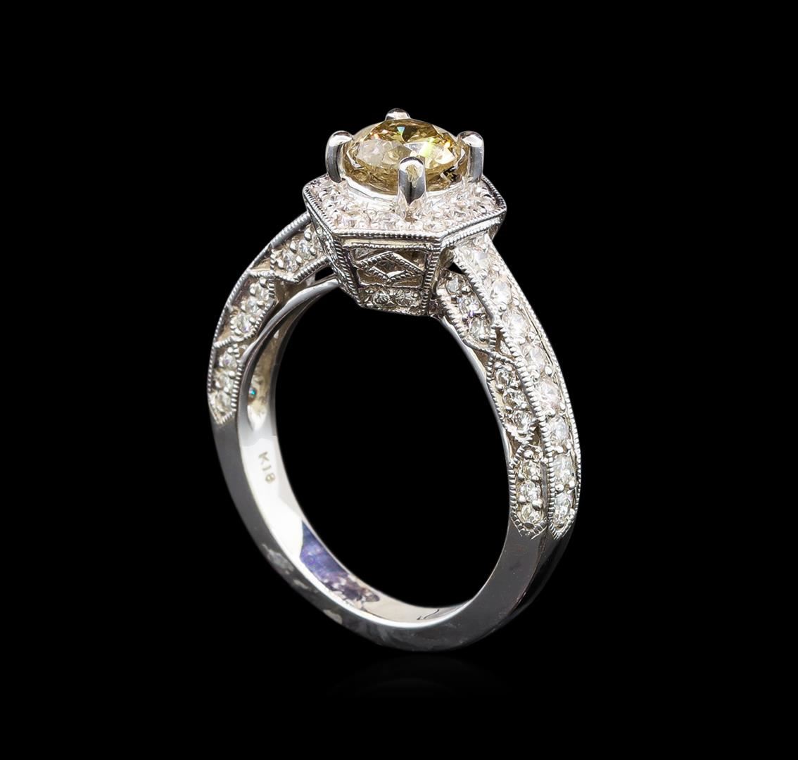 One electronically tested 18KT white gold ladies cast diamond engagement ring with a bright polish finish. Identified with markings of "18K". Condition is new. Containing: One prong set round brilliant cut diamond, measuring 5.50 - 5.50 x 3.30mm (depth est.) approximate weight of 0.61ct. Clarity: I-2, Cut is Good. Seventy-Six prong set round brilliant cut diamonds, measuring 1.70 - 1.20 x 0.87mm (depth est.) approximate total weight of 76 Stones = 0.84ct. Clarity: SI-2 to I-1. Color: H - I, Cut is Good. All diamonds are graded in the mounting, unless otherwise stated. Total Weight of Diamonds 1.45ct. Total Weight of Engagement Ring 5.80 grams. GGL Appraised at $4,430.00.
