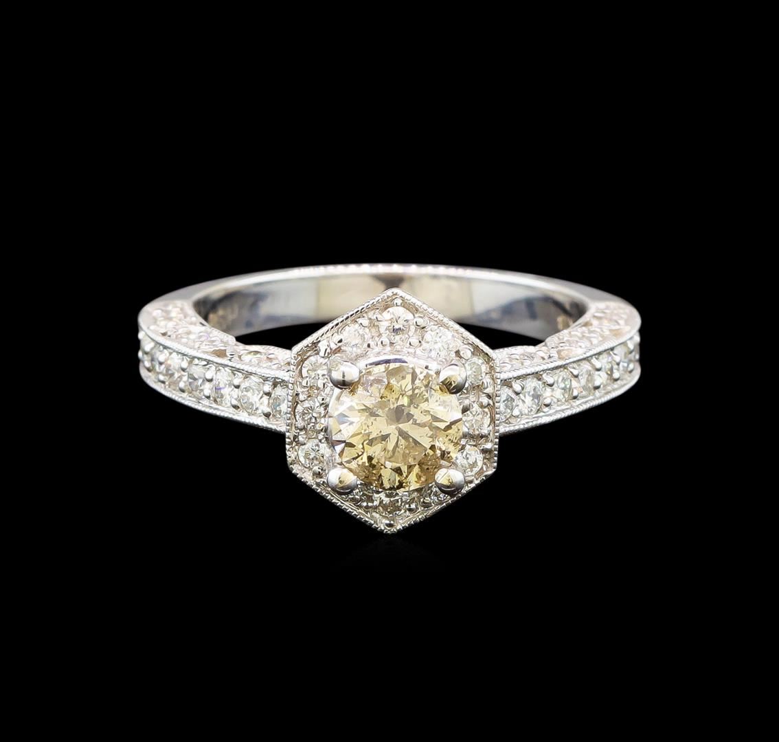 One electronically tested 18KT white gold ladies cast diamond engagement ring with a bright polish finish. Identified with markings of "18K". Condition is new. Containing: One prong set round brilliant cut diamond, measuring 5.50 - 5.50 x 3.30mm (depth est.) approximate weight of 0.61ct. Clarity: I-2, Cut is Good. Seventy-Six prong set round brilliant cut diamonds, measuring 1.70 - 1.20 x 0.87mm (depth est.) approximate total weight of 76 Stones = 0.84ct. Clarity: SI-2 to I-1. Color: H - I, Cut is Good. All diamonds are graded in the mounting, unless otherwise stated. Total Weight of Diamonds 1.45ct. Total Weight of Engagement Ring 5.80 grams. GGL Appraised at $4,430.00.