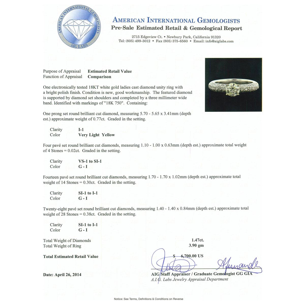 One electronically tested 18KT white gold ladies cast diamond unity ring with a bright polish finish. Condition is new, good workmanship. The featured diamond is supported by diamond set shoulders and completed by a three millimeter wide band. Identified with markings of "18K 750". Containing: One prong set round brilliant cut diamond, measuring 5.70 - 5.65 x 3.41mm (depth est.) approximate weight of 0.77ct. Graded in the setting. Clarity: I-1 Four pav, set round brilliant cut diamonds, measuring 1.10 - 1.00 x 0.63mm (depth est.) approximate. Total Weight of 4 Stones = 0.02ct. Graded in the setting. Clarity: VS-1 to SI-1 . Color: G - I Fourteen pav, set round brilliant cut diamonds, measuring 1.70 - 1.70 x 1.02mm (depth est.) approximate. Total Weight of 14 Stones = 0.30ct. Graded in the setting. Clarity: SI-1 to I-1 . Color: G - I Twenty-Eight pav, set round brilliant cut diamonds, measuring 1.40 - 1.40 x 0.84mm (depth est.) approximate. Total Weight of 28 Stones = 0.38ct. Graded in the setting. Clarity: SI-1 to I-1 . Color: G - I. Total Weight of Diamonds 1.47ct.. Total Weight of Ring 3.90 grams. AIG Appraised at $6,700.00.