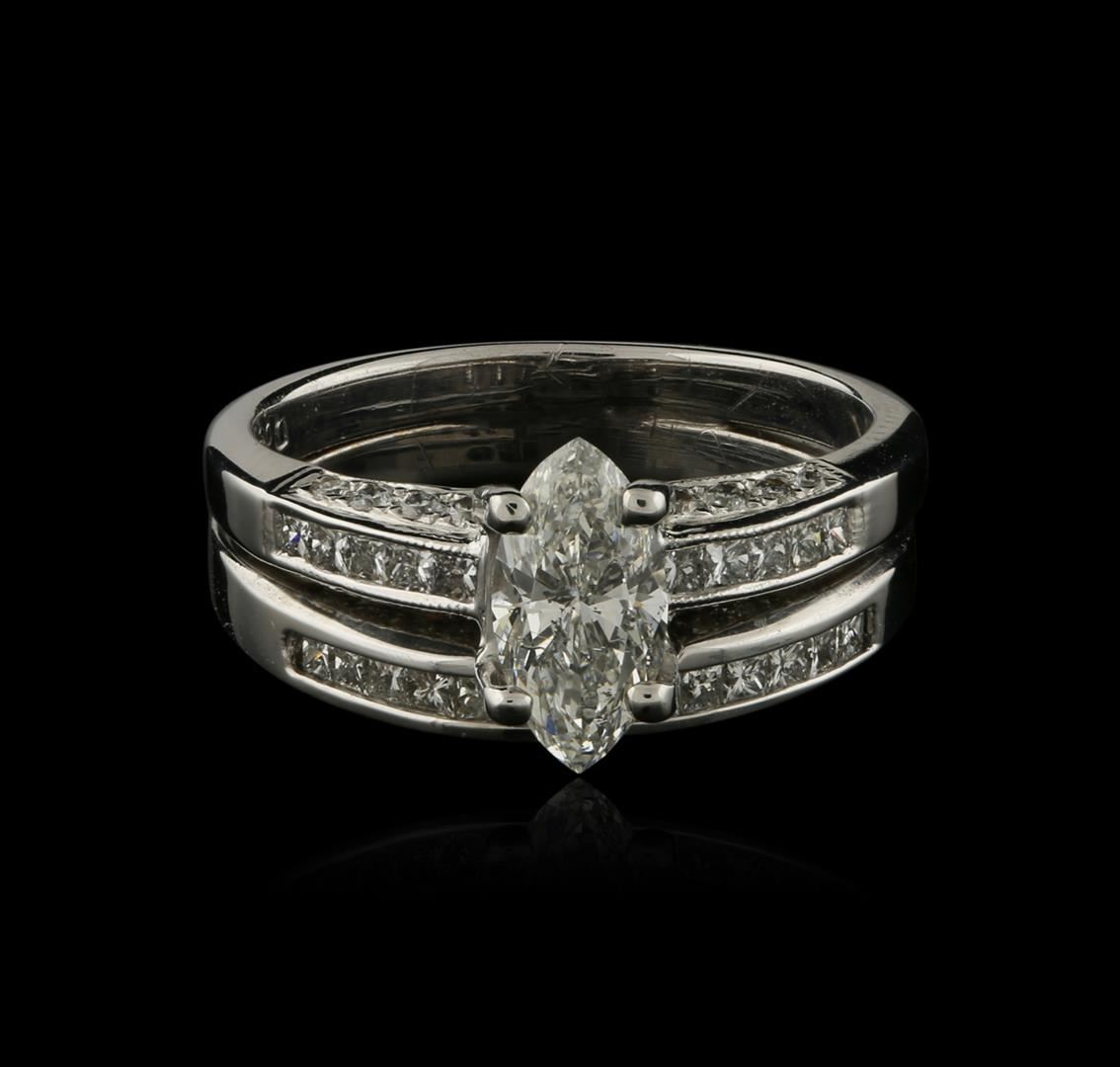 One electronically tested 18KT white gold ladies cast diamond engagement ring with a bright polish finish. Identified with markings of "18K". Condition is very good. Containing: One prong set marquise shaped cut diamond, measuring 9.50 x 4.60 x 2.89mm (depth est.) approximate weight of 0.74ct. Clarity: I-1. Color: J, Cut is Good. Twenty-Three channel set princess cut diamonds, measuring 1.50 x 1.50 x 1.13mm (depth est.) approximate total weight of 23 Stones = 0.48ct. Clarity: SI-1 to SI-2. Color: I - J, Cut is Good. Forty-Two prong set round brilliant cut diamonds, measuring 1.30 - 1.10 x 0.72mm (depth est.) approximate total weight of 42 Stones = 0.27ct. Clarity: SI-1 to SI-2. Color: H - I, Cut is Good. All diamonds are graded in the mounting, unless otherwise stated. Total Weight of Diamonds 1.48ct. Total Weight of Engagement Ring 6.00 grams. GGL Appraised at $5,855.00.