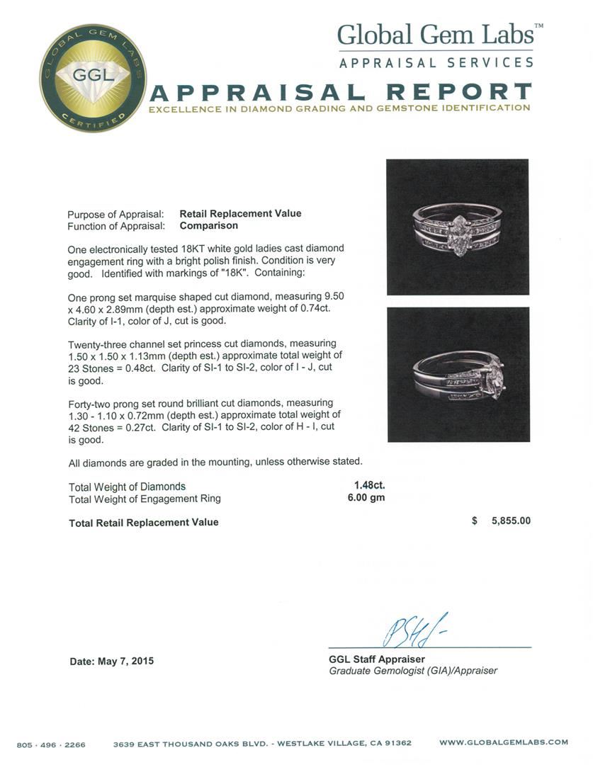One electronically tested 18KT white gold ladies cast diamond engagement ring with a bright polish finish. Identified with markings of "18K". Condition is very good. Containing: One prong set marquise shaped cut diamond, measuring 9.50 x 4.60 x 2.89mm (depth est.) approximate weight of 0.74ct. Clarity: I-1. Color: J, Cut is Good. Twenty-Three channel set princess cut diamonds, measuring 1.50 x 1.50 x 1.13mm (depth est.) approximate total weight of 23 Stones = 0.48ct. Clarity: SI-1 to SI-2. Color: I - J, Cut is Good. Forty-Two prong set round brilliant cut diamonds, measuring 1.30 - 1.10 x 0.72mm (depth est.) approximate total weight of 42 Stones = 0.27ct. Clarity: SI-1 to SI-2. Color: H - I, Cut is Good. All diamonds are graded in the mounting, unless otherwise stated. Total Weight of Diamonds 1.48ct. Total Weight of Engagement Ring 6.00 grams. GGL Appraised at $5,855.00.