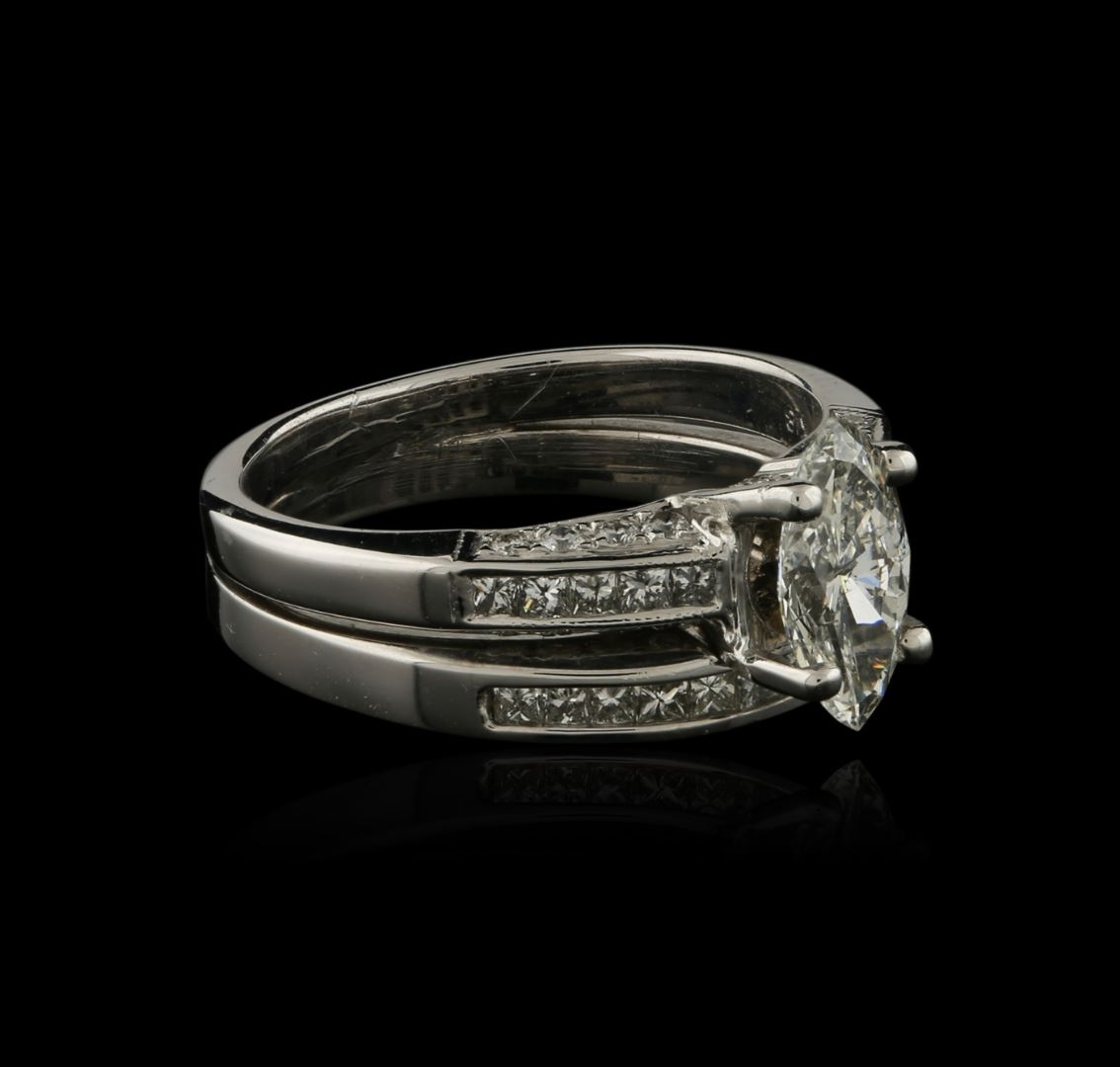 One electronically tested 18KT white gold ladies cast diamond engagement ring with a bright polish finish. Identified with markings of "18K". Condition is very good. Containing: One prong set marquise shaped cut diamond, measuring 9.50 x 4.60 x 2.89mm (depth est.) approximate weight of 0.74ct. Clarity: I-1. Color: J, Cut is Good. Twenty-Three channel set princess cut diamonds, measuring 1.50 x 1.50 x 1.13mm (depth est.) approximate total weight of 23 Stones = 0.48ct. Clarity: SI-1 to SI-2. Color: I - J, Cut is Good. Forty-Two prong set round brilliant cut diamonds, measuring 1.30 - 1.10 x 0.72mm (depth est.) approximate total weight of 42 Stones = 0.27ct. Clarity: SI-1 to SI-2. Color: H - I, Cut is Good. All diamonds are graded in the mounting, unless otherwise stated. Total Weight of Diamonds 1.48ct. Total Weight of Engagement Ring 6.00 grams. GGL Appraised at $5,855.00.