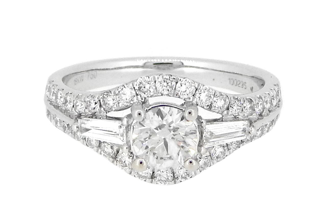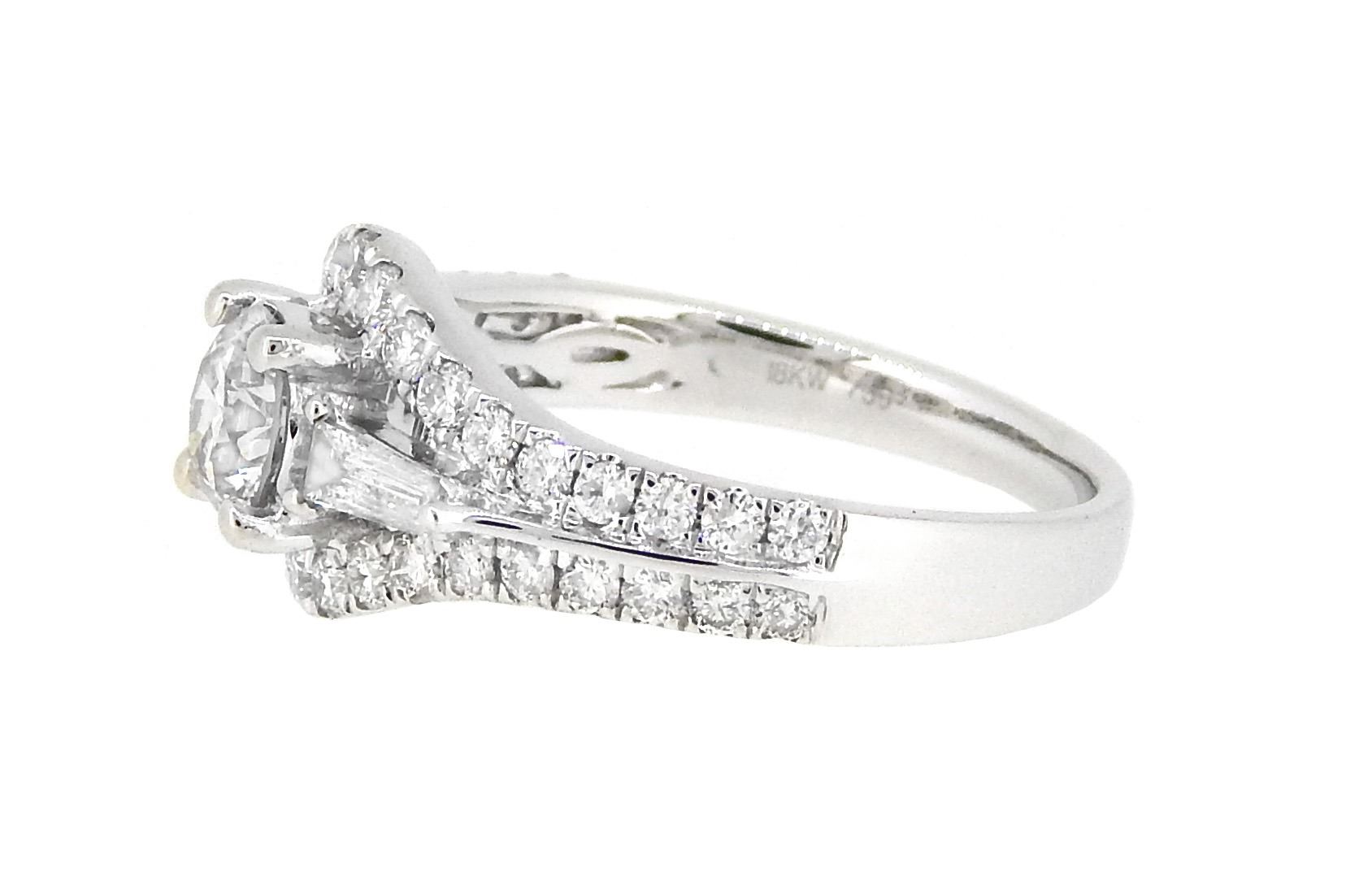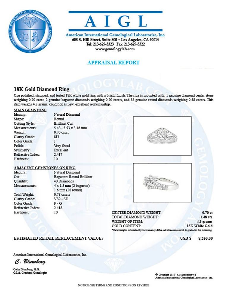 One 18KT White Gold 1.48ctw Diamond Ring. (1) Center Diamond with a total weight of 0.70cts. (40) Diamonds with a total weight of 0.78cts. Total weigh of this ring is 4.3 grams.