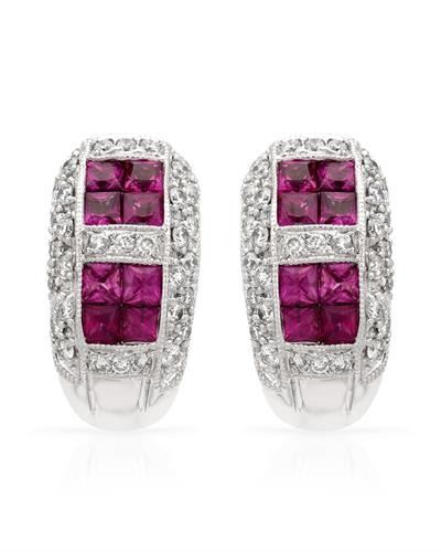 One 18KT White Gold 1.49ctw Ruby and Diamond Earrings. (16) Rubies with a total weight of 1.49cts. (62) Round Diamonds with a total weight of 0.61cts with a color of H and clarity of SI-1. Total weight of these earrings are 8.05 grams.