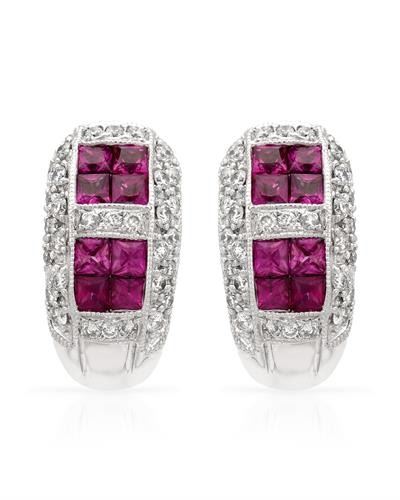 One 18KT White Gold 1.49ctw Ruby and Diamond Earrings. (16) Rubies with a total weight of 1.49cts. (62) Round Diamonds with a total weight of 0.61cts with a color of H and clarity of SI-1. Total weight of these earrings are 8.05 grams.