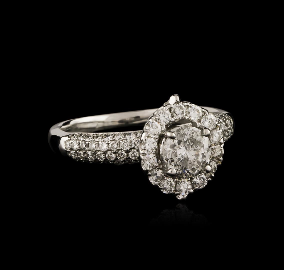 One electronically tested 18KT white gold ladies cast diamond engagement ring with a bright polish finish. Identified with markings of "18K". Condition is new. Containing: One prong set round brilliant cut diamond, measuring 5.60 - 5.50 x 3.33mm (depth est.) approximate weight of 0.63ct. Clarity: I-2. Color: J, Cut is Good. Eighty-One prong set round brilliant cut diamonds, measuring 1.70 - 1.20 x 0.87mm (depth est.) approximate total weight of 81 Stones = 0.90ct. Clarity: SI-1 to I-1. Color: I - J, Cut is Good. All diamonds are graded in the mounting, unless otherwise stated. Total Weight of Diamonds 1.53ct. Total Weight of Engagement Ring 4.10 grams. GGL Appraised at $4,375.00.