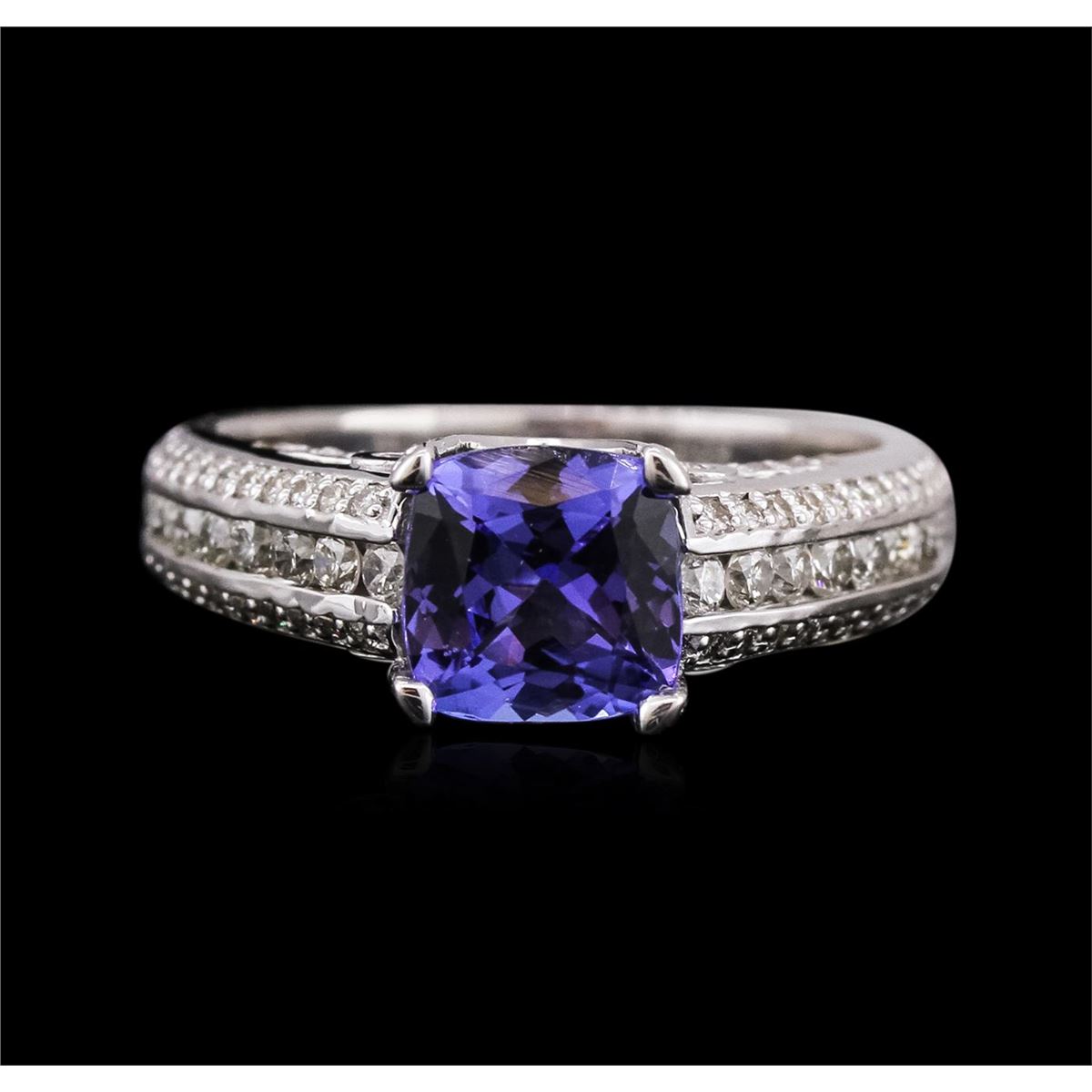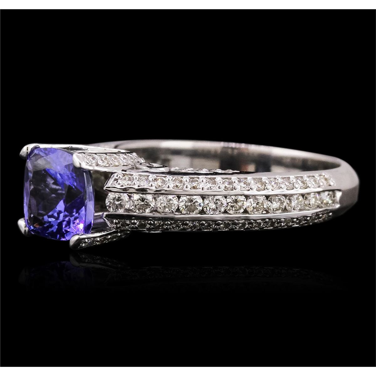 One electronically tested 18KT white gold ladies cast tanzanite and diamond ring with a bright polish finish. Identified with markings of "18K". Condition is new. Containing: One prong set square cushion modified brilliant cut natural tanzanite, measuring 6.70 x 6.67 x 4.35mm, approximate weight of 1.53ct., clarity is eye clean, type I, medium light, very slightly grayish, violet color, (GIA V 4/3), cut is very good. One Hundred Ten prong set round brilliant cut diamonds, measuring 1.10 - 1.10 x 0.66mm (depth est.) approximate total weight of 110 Stones = 0.53ct. Clarity: SI-2 to I-1. Color: J - K, Cut is Good. Twenty-Two channel set round brilliant cut diamonds, measuring 1.60 - 1.60 x 0.96mm (depth est.) approximate total weight of 22 Stones = 0.33ct. Clarity: SI-2. Color: J - K, Cut is Good. Colored gemstones are presumed to have been subjected to commonly used enhancement processes. All diamonds and colored gemstones are graded in the mounting, unless otherwise stated. Total Weight of Colored Stones 1.53ct. Total Weight of Diamonds 0.86ct. Total Weight of Ring 6.20 grams. GGL Appraised at $4,880.00.