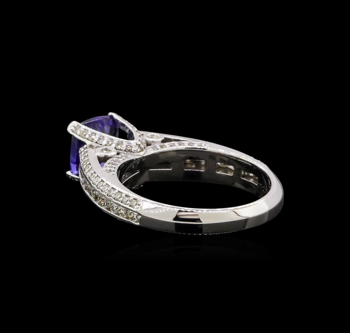 One electronically tested 18KT white gold ladies cast tanzanite and diamond ring with a bright polish finish. Identified with markings of "18K". Condition is new. Containing: One prong set square cushion modified brilliant cut natural tanzanite, measuring 6.70 x 6.67 x 4.35mm, approximate weight of 1.53ct., clarity is eye clean, type I, medium light, very slightly grayish, violet color, (GIA V 4/3), cut is very good. One Hundred Ten prong set round brilliant cut diamonds, measuring 1.10 - 1.10 x 0.66mm (depth est.) approximate total weight of 110 Stones = 0.53ct. Clarity: SI-2 to I-1. Color: J - K, Cut is Good. Twenty-Two channel set round brilliant cut diamonds, measuring 1.60 - 1.60 x 0.96mm (depth est.) approximate total weight of 22 Stones = 0.33ct. Clarity: SI-2. Color: J - K, Cut is Good. Colored gemstones are presumed to have been subjected to commonly used enhancement processes. All diamonds and colored gemstones are graded in the mounting, unless otherwise stated. Total Weight of Colored Stones 1.53ct. Total Weight of Diamonds 0.86ct. Total Weight of Ring 6.20 grams. GGL Appraised at $4,880.00.