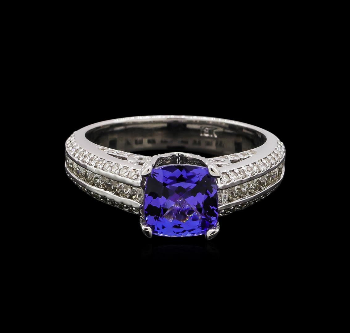 One electronically tested 18KT white gold ladies cast tanzanite and diamond ring with a bright polish finish. Identified with markings of "18K". Condition is new. Containing: One prong set square cushion modified brilliant cut natural tanzanite, measuring 6.70 x 6.67 x 4.35mm, approximate weight of 1.53ct., clarity is eye clean, type I, medium light, very slightly grayish, violet color, (GIA V 4/3), cut is very good. One Hundred Ten prong set round brilliant cut diamonds, measuring 1.10 - 1.10 x 0.66mm (depth est.) approximate total weight of 110 Stones = 0.53ct. Clarity: SI-2 to I-1. Color: J - K, Cut is Good. Twenty-Two channel set round brilliant cut diamonds, measuring 1.60 - 1.60 x 0.96mm (depth est.) approximate total weight of 22 Stones = 0.33ct. Clarity: SI-2. Color: J - K, Cut is Good. Colored gemstones are presumed to have been subjected to commonly used enhancement processes. All diamonds and colored gemstones are graded in the mounting, unless otherwise stated. Total Weight of Colored Stones 1.53ct. Total Weight of Diamonds 0.86ct. Total Weight of Ring 6.20 grams. GGL Appraised at $4,880.00.