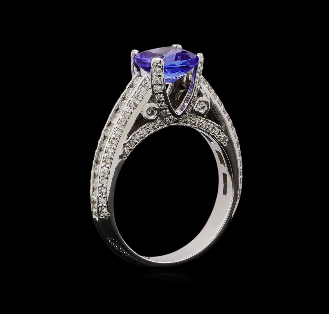 One electronically tested 18KT white gold ladies cast tanzanite and diamond ring with a bright polish finish. Identified with markings of "18K". Condition is new. Containing: One prong set square cushion modified brilliant cut natural tanzanite, measuring 6.70 x 6.67 x 4.35mm, approximate weight of 1.53ct., clarity is eye clean, type I, medium light, very slightly grayish, violet color, (GIA V 4/3), cut is very good. One Hundred Ten prong set round brilliant cut diamonds, measuring 1.10 - 1.10 x 0.66mm (depth est.) approximate total weight of 110 Stones = 0.53ct. Clarity: SI-2 to I-1. Color: J - K, Cut is Good. Twenty-Two channel set round brilliant cut diamonds, measuring 1.60 - 1.60 x 0.96mm (depth est.) approximate total weight of 22 Stones = 0.33ct. Clarity: SI-2. Color: J - K, Cut is Good. Colored gemstones are presumed to have been subjected to commonly used enhancement processes. All diamonds and colored gemstones are graded in the mounting, unless otherwise stated. Total Weight of Colored Stones 1.53ct. Total Weight of Diamonds 0.86ct. Total Weight of Ring 6.20 grams. GGL Appraised at $4,880.00.