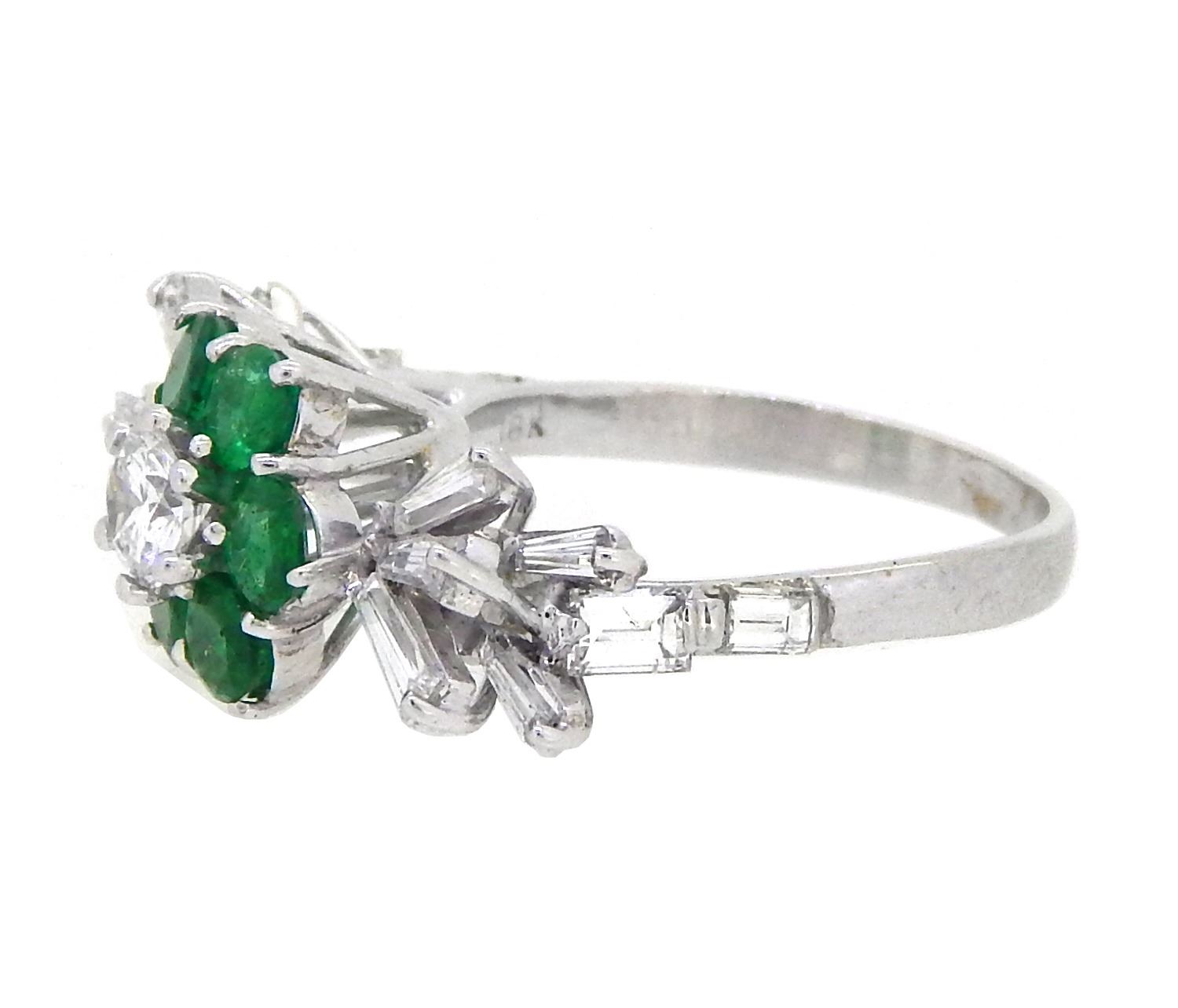 One 18KT White Gold 1.56ctw Diamond and Emerald Ring. (1) Round center Diamond with a total weight of 0.25cts with a color of E and clarity of VS-1. (14) baguette Diamonds with a total weight of 1.31cts with a color of E-F and clarity of VS-1 to SI-1. (6) Emerald with a total weight of 1.00cts. Total weight of this ring is 5.2 grams.