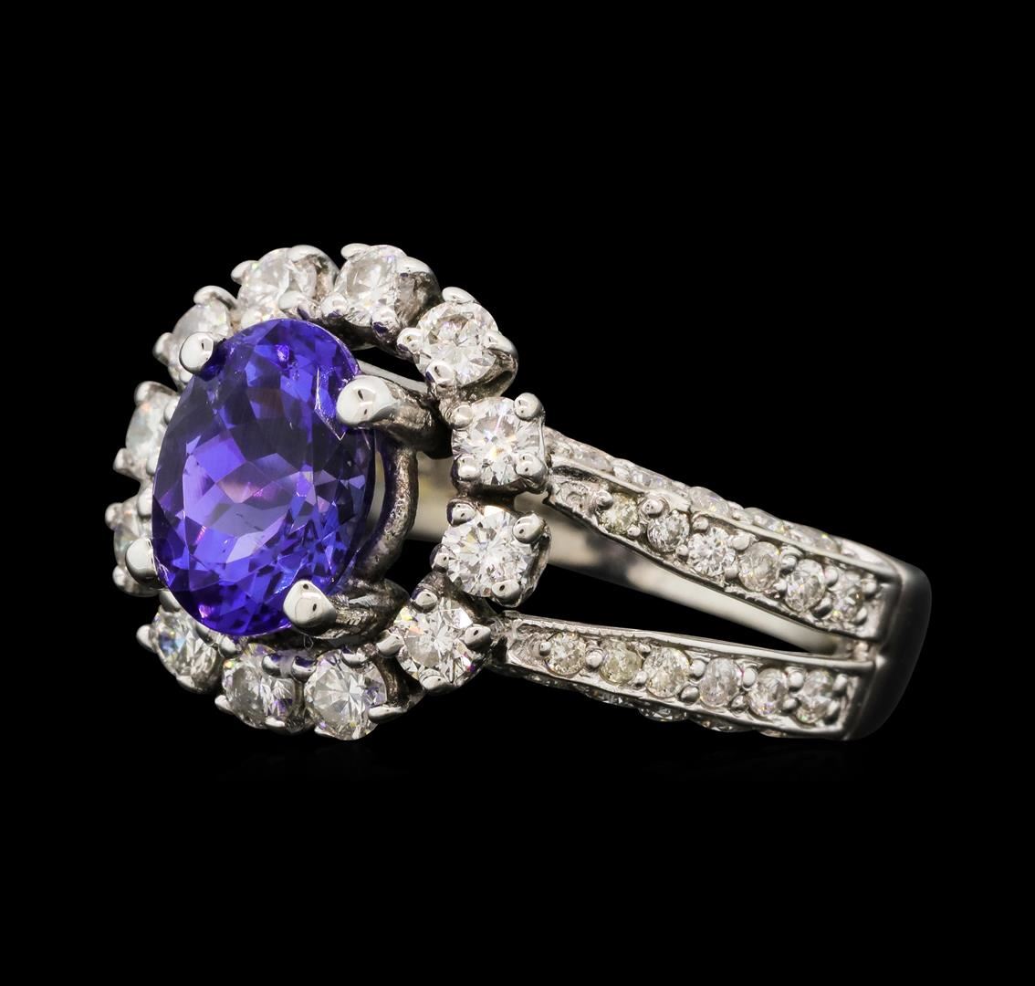 One electronically tested 18KT white gold lady's cast fashion ring with a split shank basket halo with a bright polish with milgrain detailing finish. The featured lady's ring has a shank measuring 2.81 millimeters wide. Identified with markings of "18K 750". Condition is like new, good workmanship. Containing: One prong set oval modified brilliant cut natural tanzanite, measuring 7.98 x 6.02 x 4.79mm, (depth est.) approximate weight of 1.59ct., clarity is eye clean, dark, moderately strong, violetish blue color, (GIA vB 7/4), cut is very good. Transmitting light with no distortion, transparent. Colored gemstones are presumed to have been subjected to commonly used enhancement processes. Graded in the setting. Twelve prong set round brilliant cut diamonds, measuring 2.30 - 2.20 x 1.40mm (depth est.) approximate. Total Weight of 12 Stones = 0.52ct. Graded in the setting. Color H - I Clarity SI-1 to SI-2 Cut Good Thirty-Six prong set round brilliant cut diamonds, measuring 1.50 - 1.40 x 0.90mm (depth est.) approximate. Total Weight of 36 Stones = 0.42ct. Graded in the setting. Color H - I Clarity SI-2 to I-1 Cut Good Eight prong set round brilliant cut diamonds, measuring 1.00 - 0.90 x 0.59mm (depth est.) approximate. Total Weight of 8 Stones = 0.03ct. Graded in the setting. Color H - I Clarity SI-2 to I-1 Cut Good. Total Weight of Colored Stones 1.59ct.. Total Weight of Diamonds 0.97ct.. Total Weight of Ring 5.30gm. GAS Appraised.