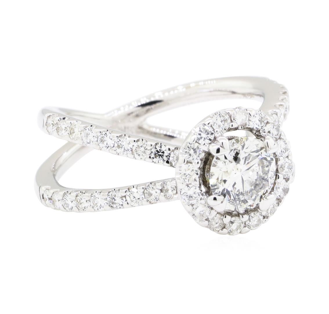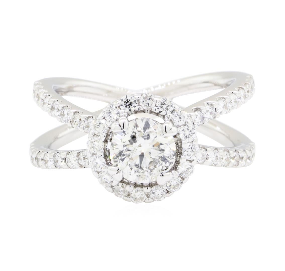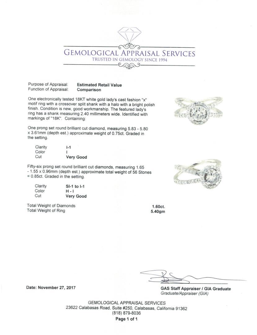 One electronically tested 18KT white gold lady's cast fashion 'x' motif ring with a crossover split shank with a halo with a bright polish finish. The featured lady's ring has a shank measuring 2.40 millimeters wide. Identified with markings of '18K'. Condition is new, good workmanship. Containing: One prong set round brilliant cut diamond, measuring 5.83 - 5.80 x 3.61mm (depth est.) approximate weight of 0.75ct. Graded in the setting. Color I Clarity I-1 Cut Very Good Fifty-Six prong set round brilliant cut diamonds, measuring 1.65 - 1.55 x 0.96mm (depth est.) approximate total weight of 56 Stones = 0.85ct. Graded in the setting. Color H - I Clarity SI-1 to I-1 Cut Very Good. Total Weight of Diamonds 1.60ct.. Total Weight of Ring 5.40gm. GAS Appraised.