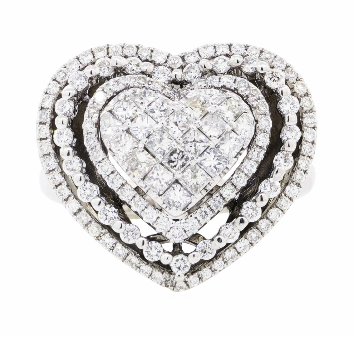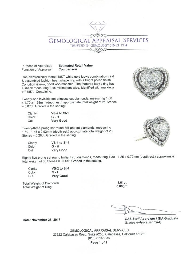 One electronically tested 18KT white gold lady's combination cast & assembled fashion heart shape ring with a bright polish finish. The featured lady's ring has a shank measuring 2.45 millimeters wide. Identified with markings of '18K'. Condition is new, good workmanship. Containing: Twenty-One invisible set princess cut diamonds, measuring 1.80 x 1.70 x 1.28mm (depth est.) approximate total weight of 21 Stones = 0.67ct. Graded in the setting. Color G - H Clarity VS-2 to SI-1 Cut Very Good Twenty-Three prong set round brilliant cut diamonds, measuring 1.50 - 1.45 x 0.92mm (depth est.) approximate total weight of 23 Stones = 0.28ct. Graded in the setting. Color G - H Clarity VS-1 to SI-1 Cut Very Good Eighty-Five prong set round brilliant cut diamonds, measuring 1.30 - 1.25 x 0.79mm (depth est.) approximate total weight of 85 Stones = 0.66ct. Graded in the setting. Color G - H Clarity VS-2 to SI-1 Cut Very Good. Total Weight of Diamonds 1.61ct.. Total Weight of Ring 6.00gm. GAS Appraised.