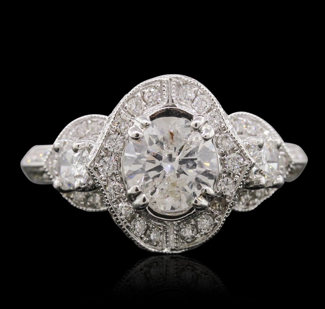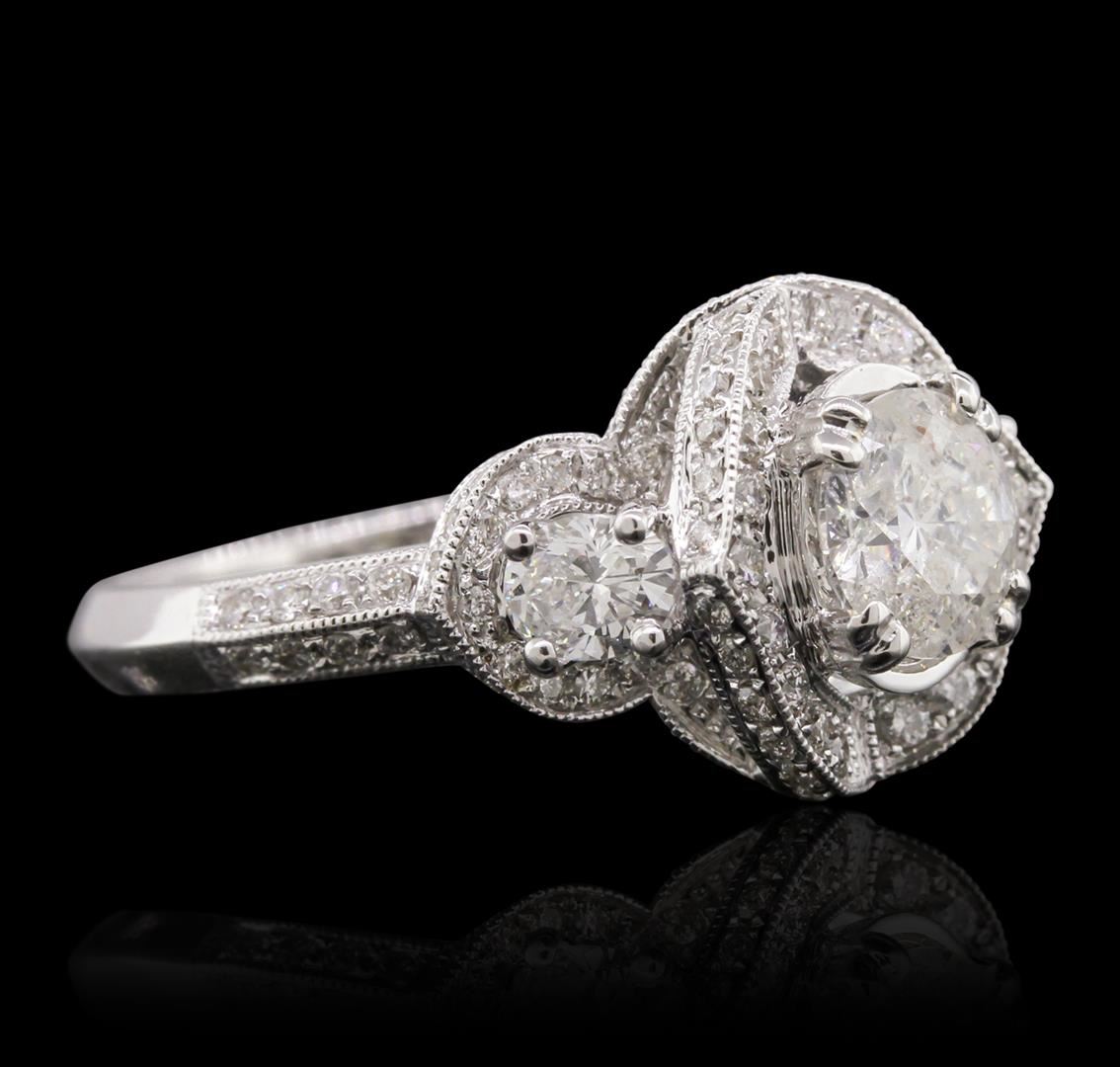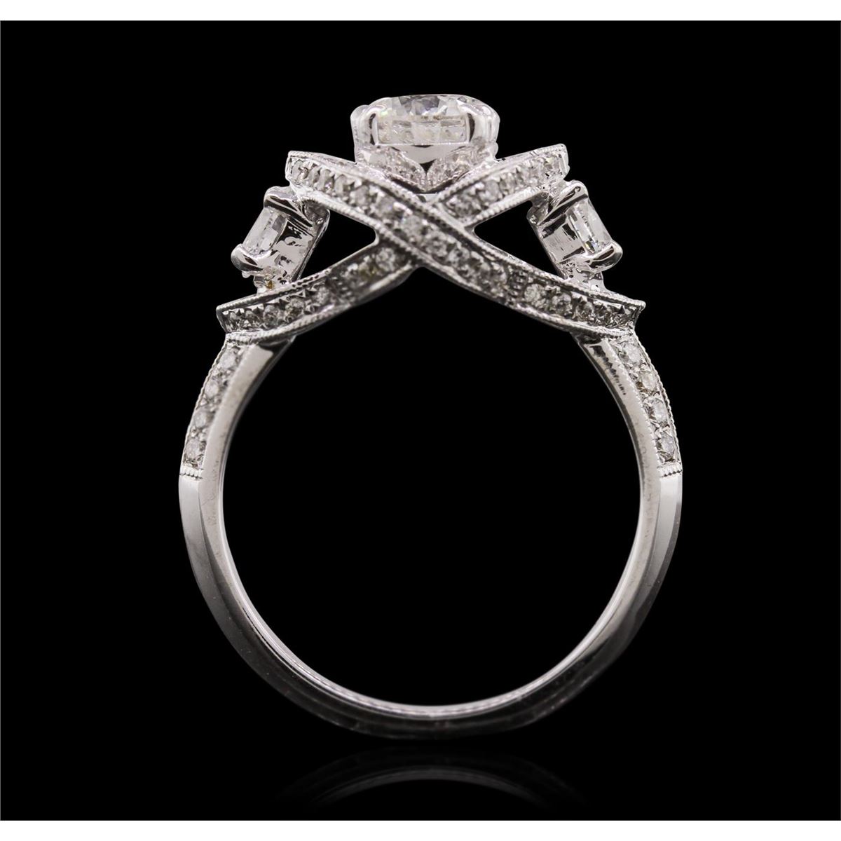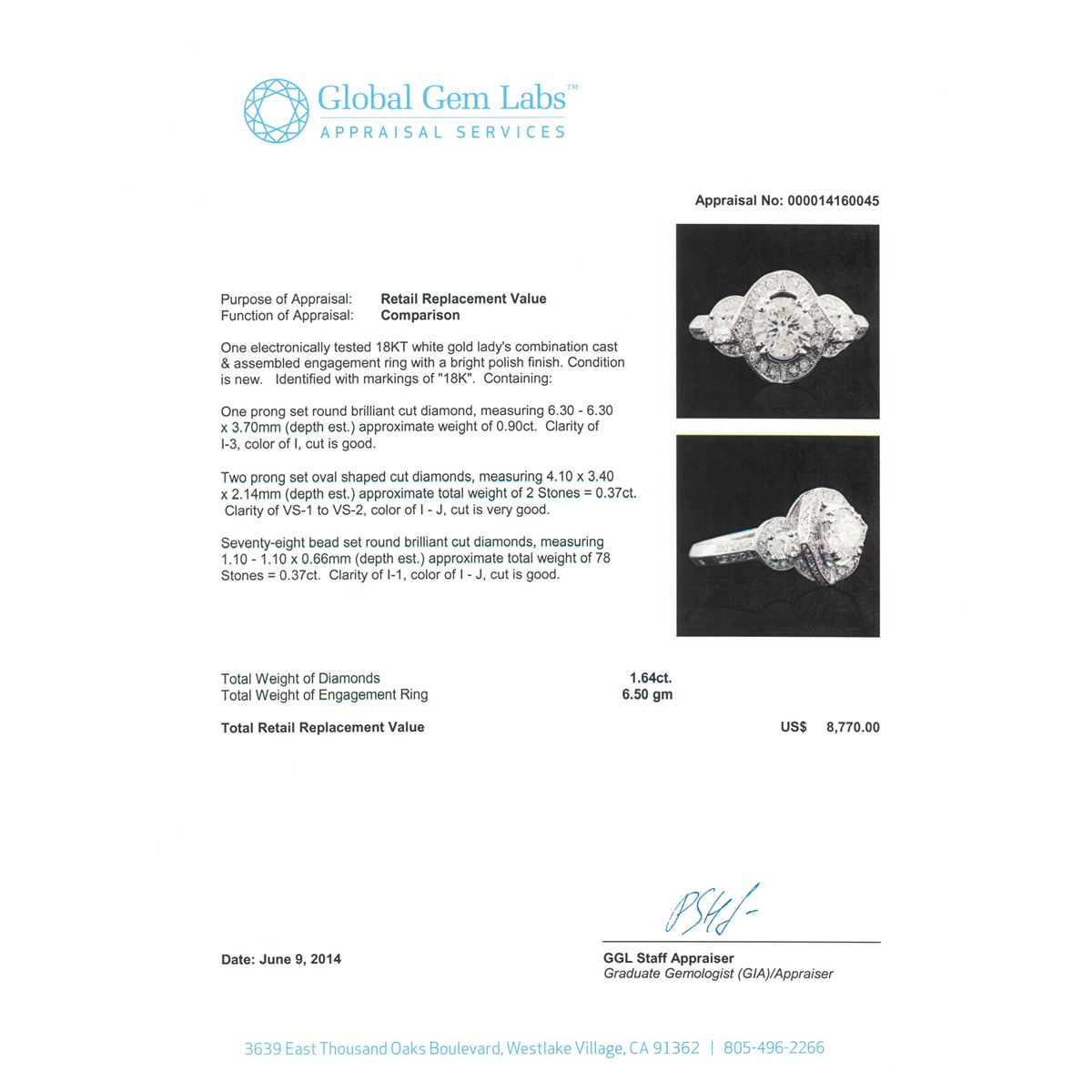One electronically tested 18KT white gold Ladies combination cast & assembled engagement ring with a bright polish finish. Condition is new. Identified with markings of "18K". Containing: One prong set round brilliant cut diamond, measuring 6.30 - 6.30 x 3.70mm (depth est.) approximate weight of 0.90ct. Clarity: I-3. Color: I, Cut is Good. Two prong set oval shaped cut diamonds, measuring 4.10 x 3.40 x 2.14mm (depth est.) approximate. Total Weight of 2 Stones = 0.37ct. Clarity: VS-1 to VS-2. Color: I - J, Cut is Very Good. Seventy-Eight bead set round brilliant cut diamonds, measuring 1.10 - 1.10 x 0.66mm (depth est.) approximate. Total Weight of 78 Stones = 0.37ct. Clarity: I-1. Color: I - J, Cut is Good. Total Weight of Diamonds 1.64ct. Total Weight of Engagement Ring 6.50 grams. GGL Appraised at $8,770.00.