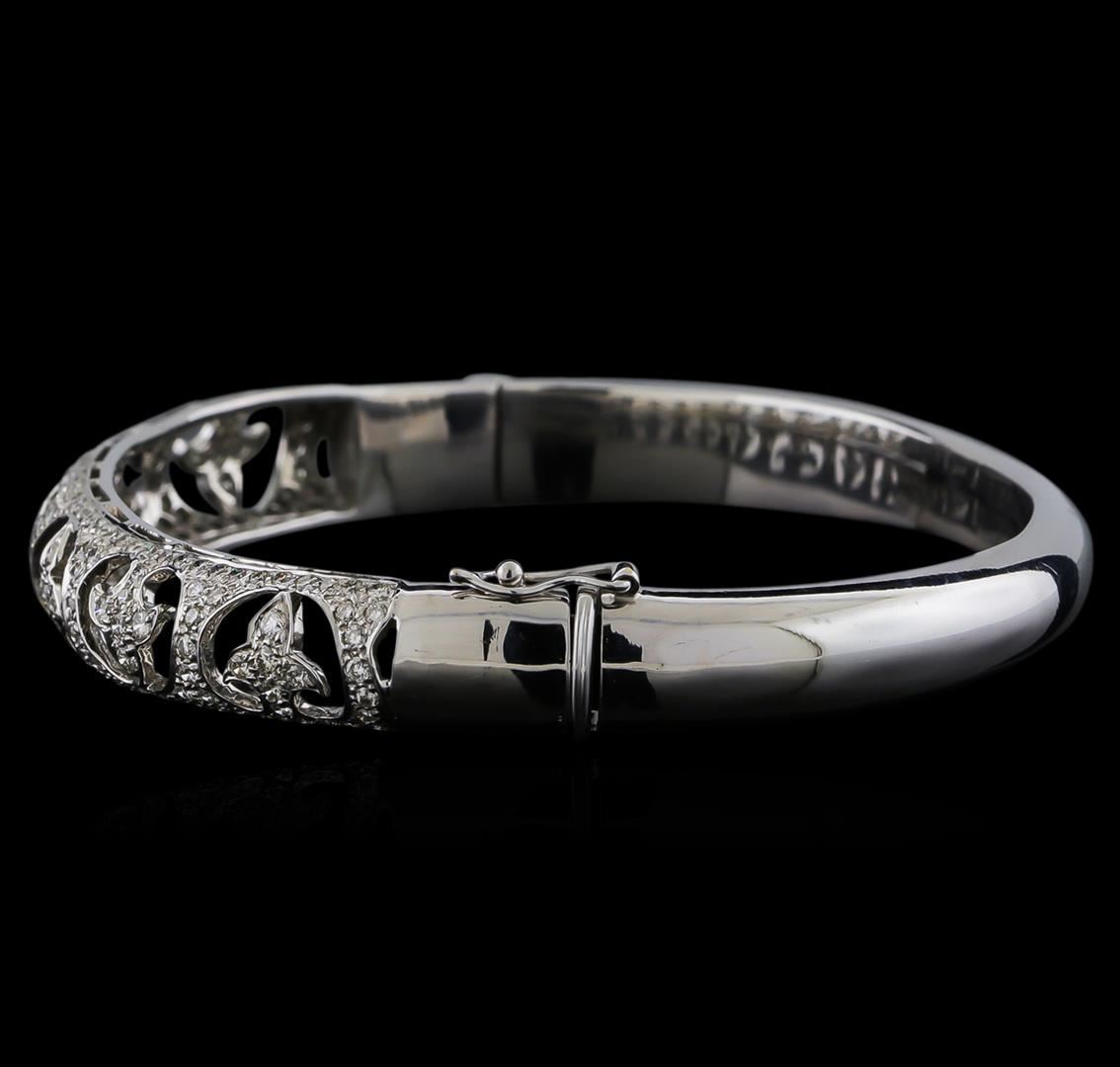 One electronically tested 18KT white gold ladies cast bangle bracelet with a bright polish finish. Measurements: 2.5" x 2.2". Condition is new. Containing: One Hundred Sixty-Seven prong set round brilliant cut diamonds, measuring 1.40 - 1.40 x 0.84mm (depth est.) approximate total weight of 167 Stones = 1.67ct. Clarity: SI-1 to SI-2. Color: J - K, Cut is Good. All diamonds are graded in the mounting, unless otherwise stated. Total Weight of Diamonds 1.67ct. Total Weight of Bracelet 25.00 grams. GGL Appraised at $7,855.00.