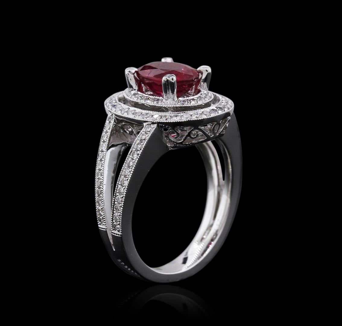 One electronically tested 18KT white gold ladies cast ruby and diamond ring with a bright polish finish. Identified with markings of "750". Condition is new. Containing: One prong set oval modified brilliant cut natural ruby, measuring 8.20 x 6.20 x 3.90mm, approximate weight of 1.67ct., clarity is heavily included, type II, medium, moderately strong, slightly purplish red color, (GIA slpR 5/4), cut is good. One Hundred Two prong set round brilliant cut diamonds, measuring 1.00 - 1.00 x 0.60mm (depth est.) approximate. Total Weight of 102 Stones = 0.57ct. Clarity: SI-2 to I-1. Color: I - J, Cut is Good. Colored gemstones are presumed to have been subjected to commonly used enhancement processes. All diamonds and colored gemstones are graded in the mounting, unless otherwise stated. Total Weight of Colored Stones 1.67ct. Total Weight of Diamonds 0.57ct. Total Weight of Ring 8.70 grams. GGL Appraised at $4,000.00.