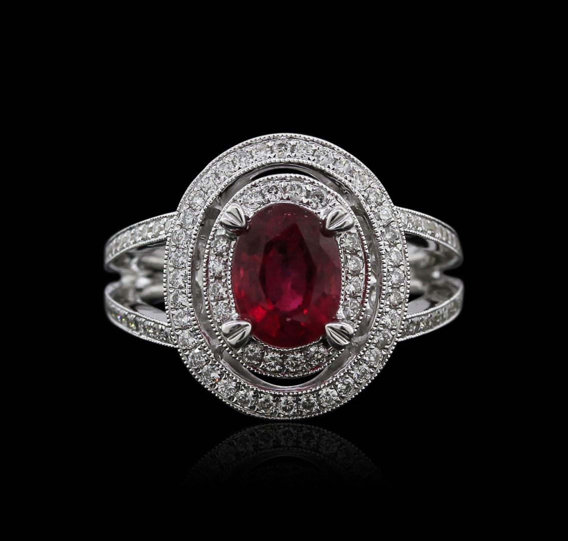 One electronically tested 18KT white gold ladies cast ruby and diamond ring with a bright polish finish. Identified with markings of "750". Condition is new. Containing: One prong set oval modified brilliant cut natural ruby, measuring 8.20 x 6.20 x 3.90mm, approximate weight of 1.67ct., clarity is heavily included, type II, medium, moderately strong, slightly purplish red color, (GIA slpR 5/4), cut is good. One Hundred Two prong set round brilliant cut diamonds, measuring 1.00 - 1.00 x 0.60mm (depth est.) approximate. Total Weight of 102 Stones = 0.57ct. Clarity: SI-2 to I-1. Color: I - J, Cut is Good. Colored gemstones are presumed to have been subjected to commonly used enhancement processes. All diamonds and colored gemstones are graded in the mounting, unless otherwise stated. Total Weight of Colored Stones 1.67ct. Total Weight of Diamonds 0.57ct. Total Weight of Ring 8.70 grams. GGL Appraised at $4,000.00.
