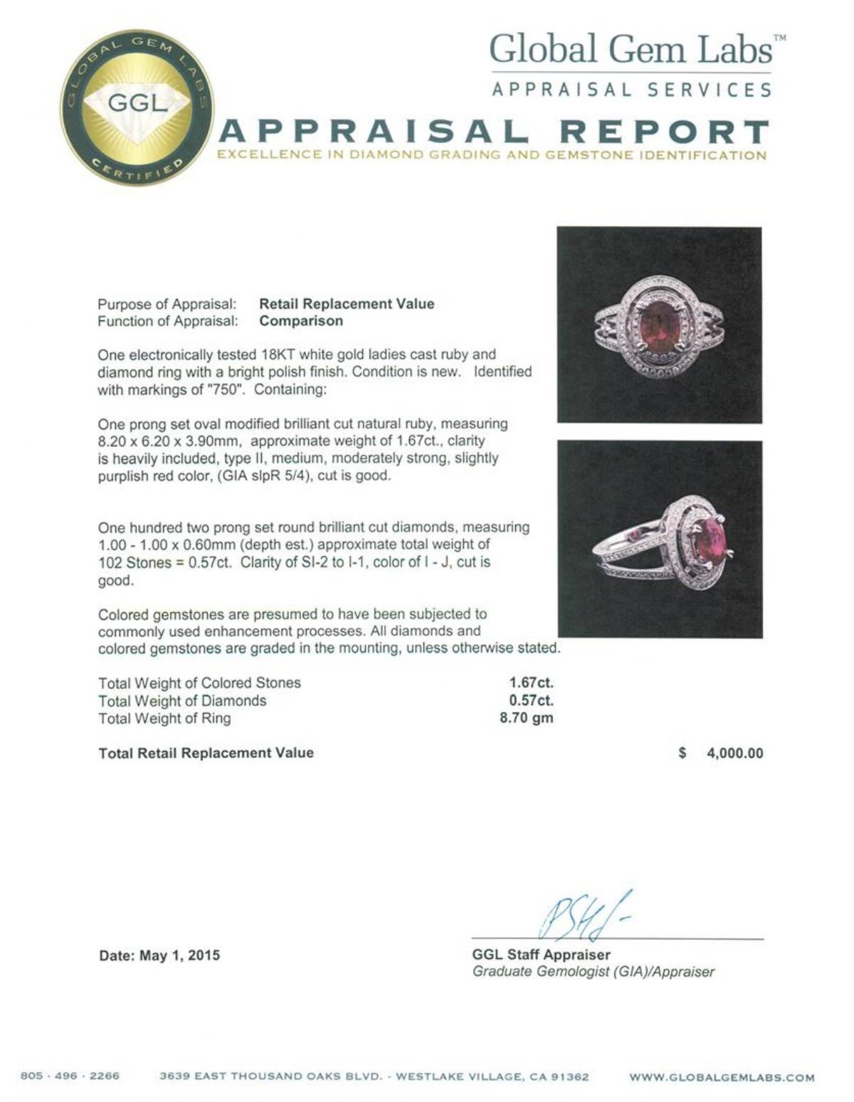 One electronically tested 18KT white gold ladies cast ruby and diamond ring with a bright polish finish. Identified with markings of "750". Condition is new. Containing: One prong set oval modified brilliant cut natural ruby, measuring 8.20 x 6.20 x 3.90mm, approximate weight of 1.67ct., clarity is heavily included, type II, medium, moderately strong, slightly purplish red color, (GIA slpR 5/4), cut is good. One Hundred Two prong set round brilliant cut diamonds, measuring 1.00 - 1.00 x 0.60mm (depth est.) approximate. Total Weight of 102 Stones = 0.57ct. Clarity: SI-2 to I-1. Color: I - J, Cut is Good. Colored gemstones are presumed to have been subjected to commonly used enhancement processes. All diamonds and colored gemstones are graded in the mounting, unless otherwise stated. Total Weight of Colored Stones 1.67ct. Total Weight of Diamonds 0.57ct. Total Weight of Ring 8.70 grams. GGL Appraised.