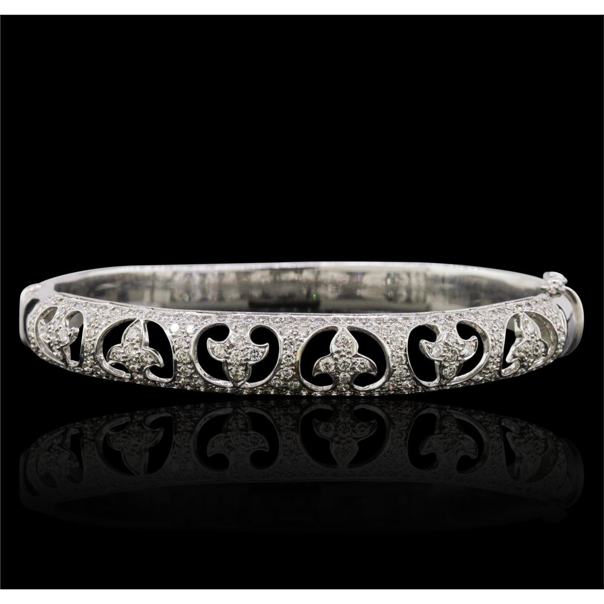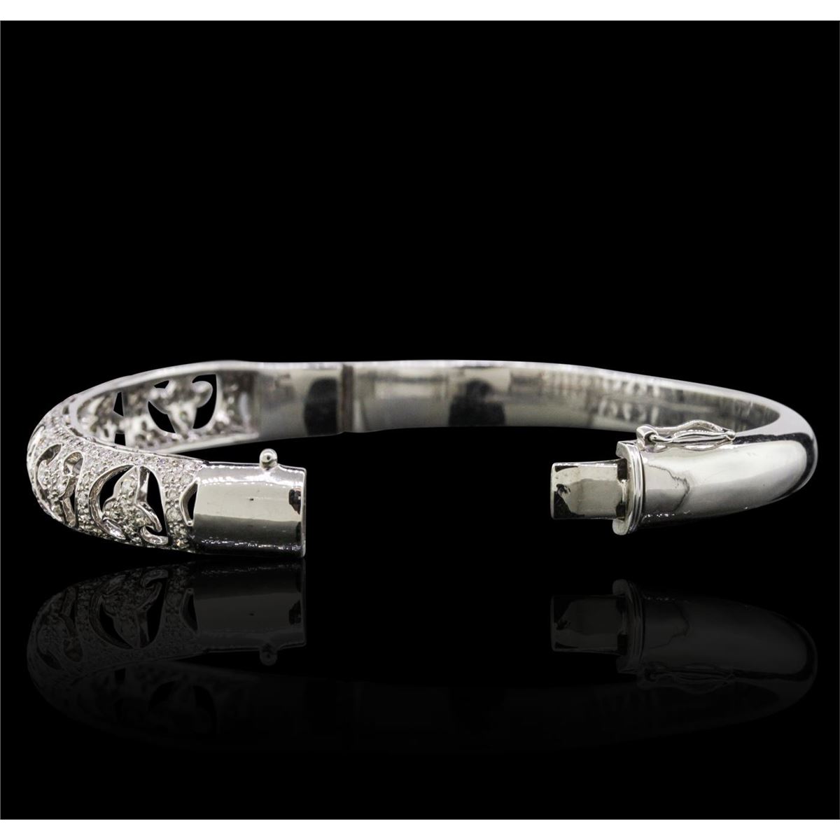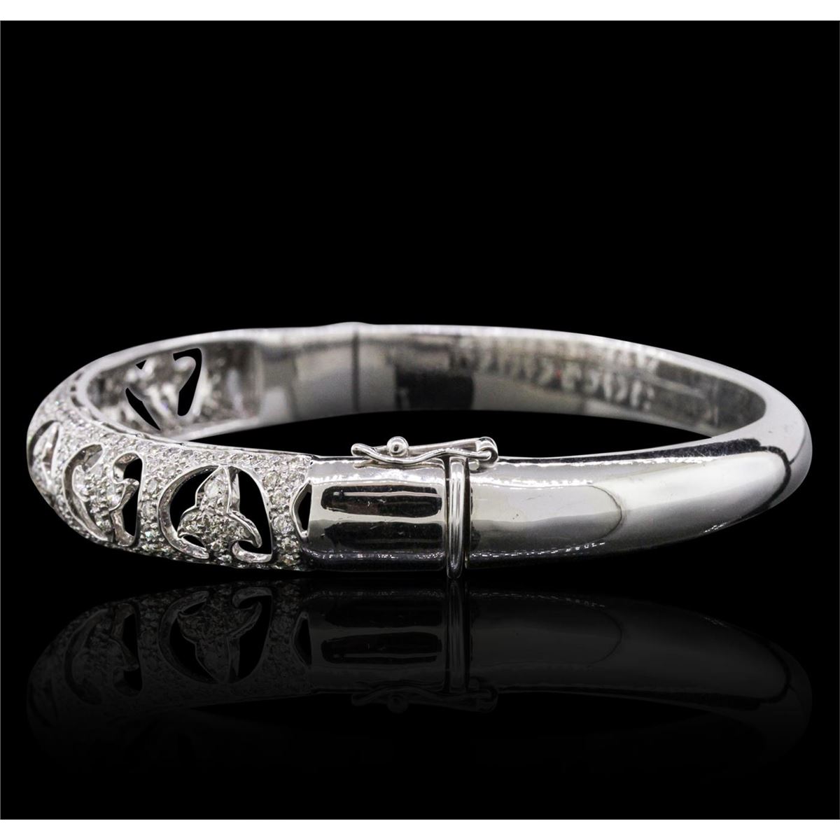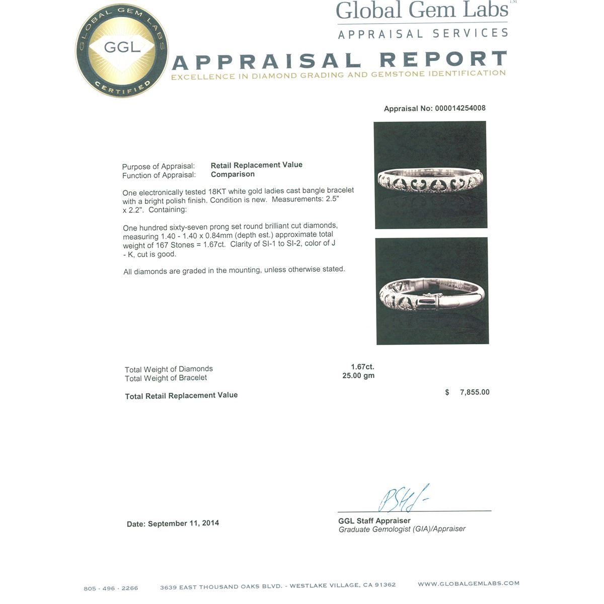 One electronically tested 18KT white gold ladies cast bangle bracelet with a bright polish finish. Measurements: 2.5" x 2.2". Condition is new. Containing: One Hundred Sixty-Seven prong set round brilliant cut diamonds, measuring 1.40 - 1.40 x 0.84mm (depth est.) approximate total weight of 167 Stones = 1.67ct. Clarity: SI-1 to SI-2. Color: J - K, Cut is Good. All diamonds are graded in the mounting, unless otherwise stated. Total Weight of Diamonds 1.67ct. Total Weight of Bracelet 25.00 grams. GGL Appraised at $7,855.00.