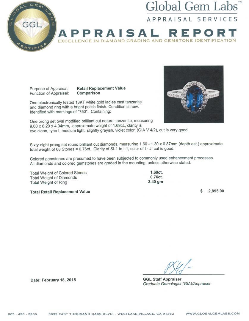 One electronically tested 18KT white gold ladies cast tanzanite and diamond ring with a bright polish finish. Identified with markings of "750". Condition is new. Containing: One prong set oval modified brilliant cut natural tanzanite, measuring 9.60 x 6.20 x 4.04mm, approximate weight of 1.69ct., clarity is eye clean, type I, medium light, slightly grayish, violet color, (GIA V 4/2), cut is very good. Sixty-Eight prong set round brilliant cut diamonds, measuring 1.60 - 1.30 x 0.87mm (depth est.) approximate total weight of 68 Stones = 0.76ct. Clarity: SI-1 to I-1. Color: I - J, Cut is Good. Colored gemstones are presumed to have been subjected to commonly used enhancement processes. All diamonds and colored gemstones are graded in the mounting, unless otherwise stated. Total Weight of Colored Stones 1.69ct. Total Weight of Diamonds 0.76ct. Total Weight of Ring 3.40 grams. GGL Appraised at $2,895.00.