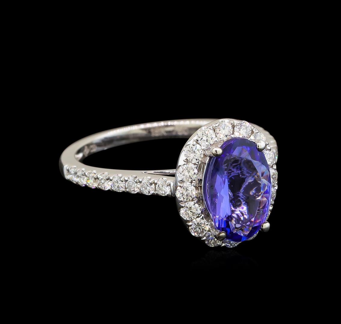 One electronically tested 18KT white gold ladies cast tanzanite and diamond ring with a bright polish finish. Identified with markings of "750". Condition is new. Containing: One prong set oval modified brilliant cut natural tanzanite, measuring 9.60 x 6.20 x 4.04mm, approximate weight of 1.69ct., clarity is eye clean, type I, medium light, slightly grayish, violet color, (GIA V 4/2), cut is very good. Sixty-Eight prong set round brilliant cut diamonds, measuring 1.60 - 1.30 x 0.87mm (depth est.) approximate total weight of 68 Stones = 0.76ct. Clarity: SI-1 to I-1. Color: I - J, Cut is Good. Colored gemstones are presumed to have been subjected to commonly used enhancement processes. All diamonds and colored gemstones are graded in the mounting, unless otherwise stated. Total Weight of Colored Stones 1.69ct. Total Weight of Diamonds 0.76ct. Total Weight of Ring 3.40 grams. GGL Appraised at $2,895.00.