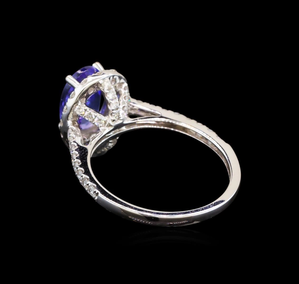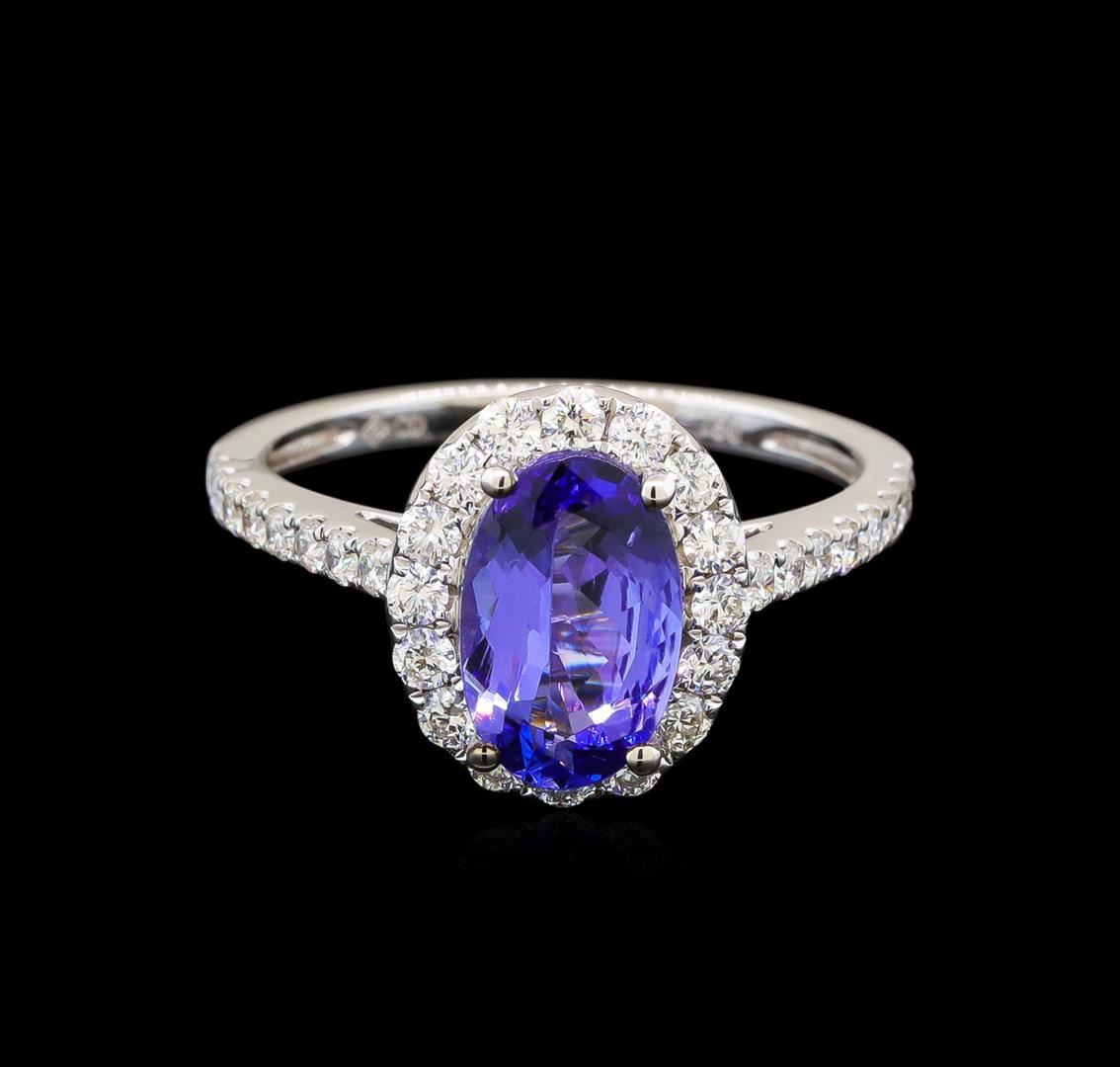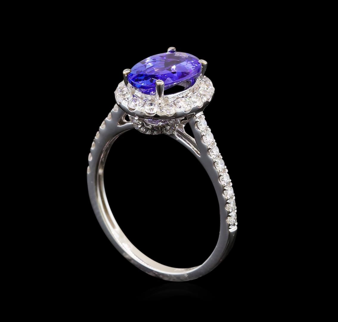 One electronically tested 18KT white gold ladies cast tanzanite and diamond ring with a bright polish finish. Identified with markings of "750". Condition is new. Containing: One prong set oval modified brilliant cut natural tanzanite, measuring 9.60 x 6.20 x 4.04mm, approximate weight of 1.69ct., clarity is eye clean, type I, medium light, slightly grayish, violet color, (GIA V 4/2), cut is very good. Sixty-Eight prong set round brilliant cut diamonds, measuring 1.60 - 1.30 x 0.87mm (depth est.) approximate total weight of 68 Stones = 0.76ct. Clarity: SI-1 to I-1. Color: I - J, Cut is Good. Colored gemstones are presumed to have been subjected to commonly used enhancement processes. All diamonds and colored gemstones are graded in the mounting, unless otherwise stated. Total Weight of Colored Stones 1.69ct. Total Weight of Diamonds 0.76ct. Total Weight of Ring 3.40 grams. GGL Appraised at $2,895.00.