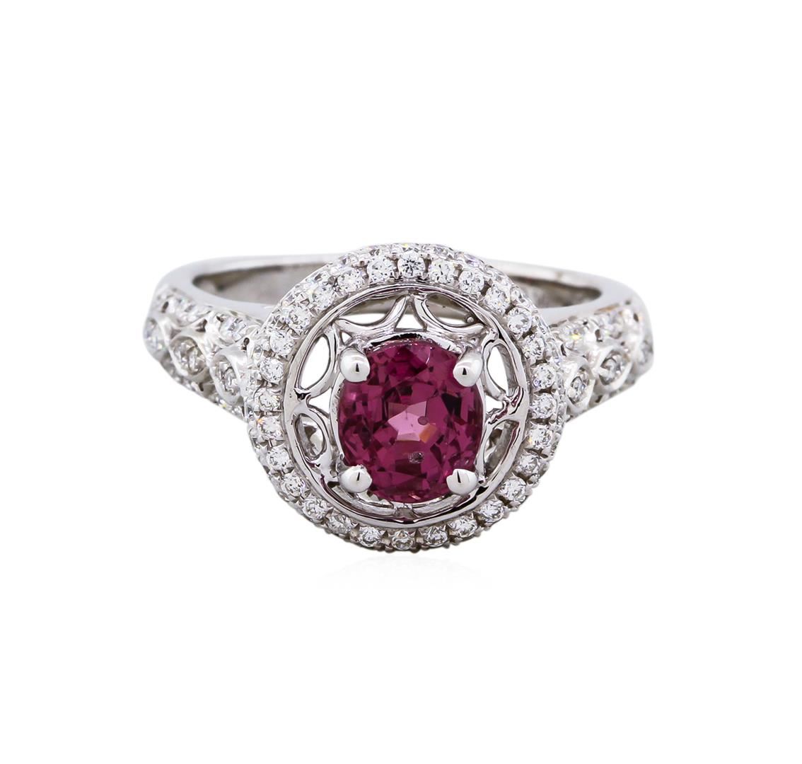 One stunning spinel and diamond ring set in 18KT white gold weighing 6.20 grams containing a 1.69 carat round prong-set spinel center stone beautifully showcased by ninety-four round diamonds with a total weight of 0.47 carats.