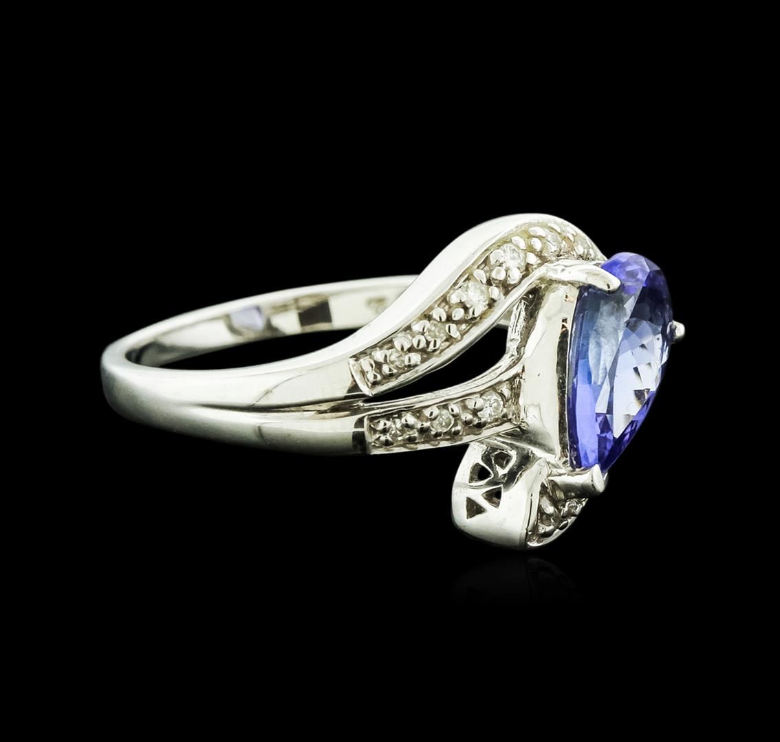 One electronically tested 18KT white gold ladies cast tanzanite and diamond ring with a bright polish finish. Identified with markings of "18K". Condition is new. Containing: One prong set pear modified brilliant cut natural tanzanite, measuring 10.30 x 6.20 x 4.03mm, approximate weight of 1.72ct., clarity is eye clean, type I, medium light, very slightly grayish, violet color, (GIA V 4/3), cut is good. Sixteen prong set single cut diamonds, measuring 1.50 - 1.20 x 0.81mm (depth est.) approximate total weight of 16 Stones = 0.14ct. Clarity: I-1 to I-2. Color: I - J. Colored gemstones are presumed to have been subjected to commonly used enhancement processes. All diamonds and colored gemstones are graded in the mounting, unless otherwise stated. Total Weight of Colored Stones 1.72ct. Total Weight of Diamonds 0.14ct. Total Weight of Ring 5.50 grams. GGL Appraised at $2,070.00.