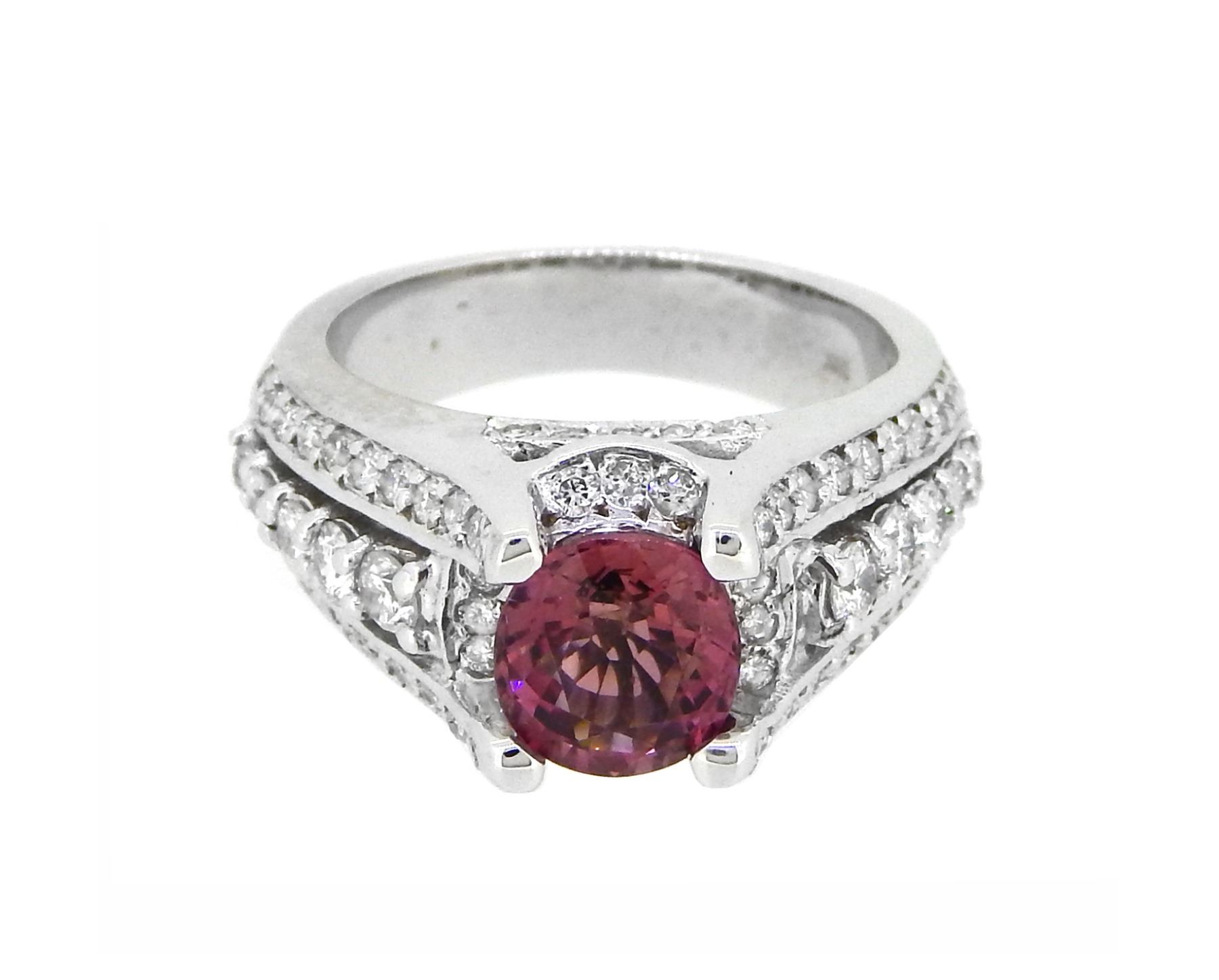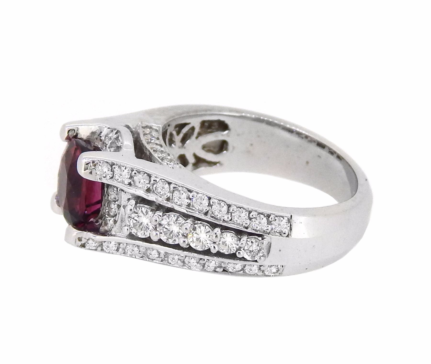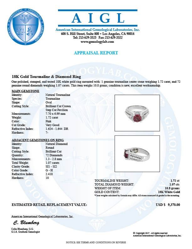 One 18KT White Gold 1.72ct Tourmaline and Diamond Ring. (1) Tourmaline with a total weight of 1.72cts. (72) diamonds with a total weight of 1.07cts. Total weight of this ring is 10.8 grams.