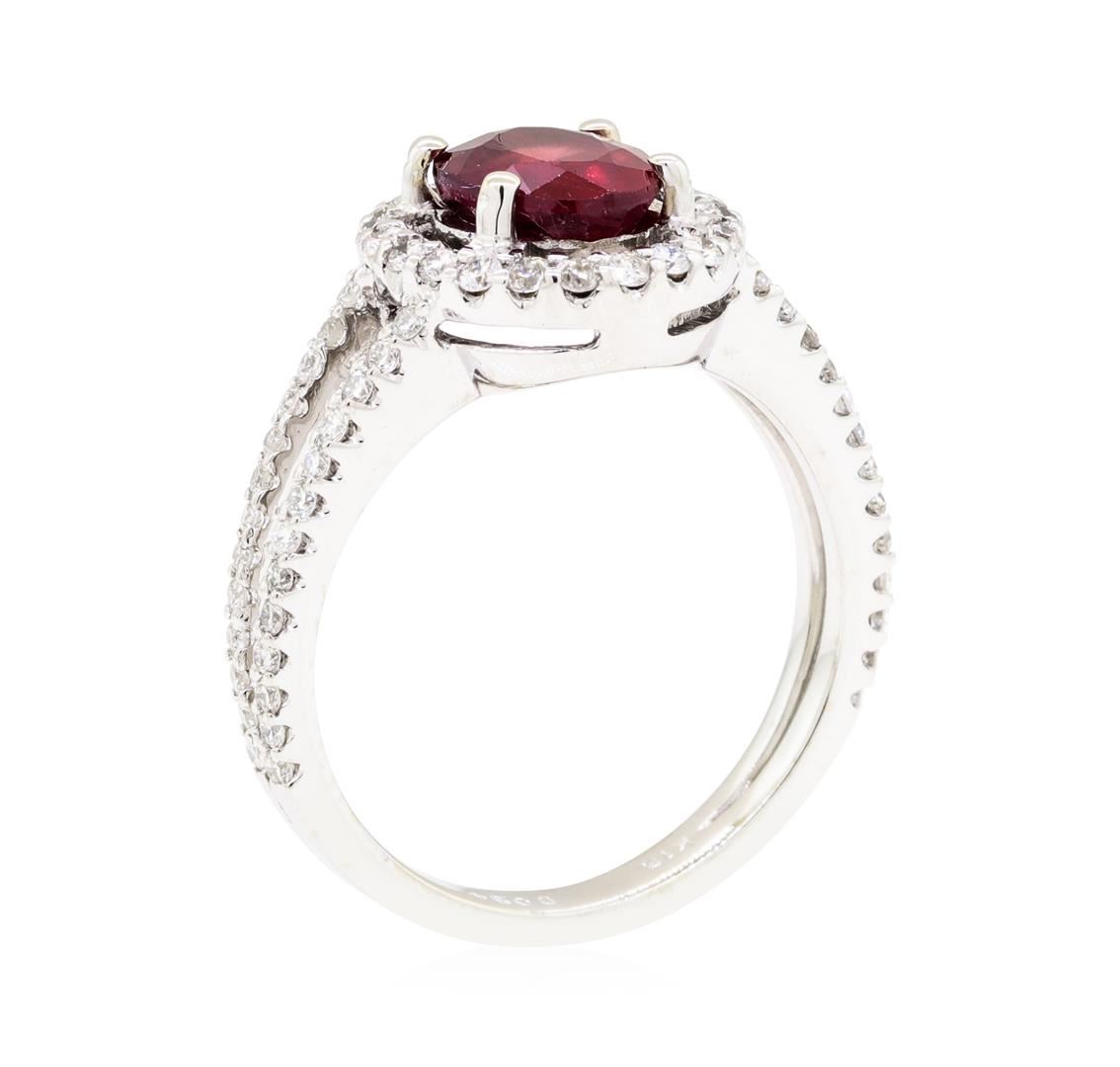 One electronically tested 18KT white gold lady's cast fashion ring with a split shank halo with a bright polish finish. The featured lady's ring has a shank measuring 2.35 millimeters wide. Identified with markings of '18K'. Condition is new, good workmanship. Containing: One prong set oval modified mixed cut natural ruby-glass composite, measuring 7.86 x 6.06 x 4.00mm, (depth est.) 5%. bulge factor, approximate weight of 1.74ct., clarity is heavily included, medium dark, very slightly brownish, orangy red color, (GIA oR 6/3), cut is good. Transmitting light somewhat diffusely, semi-transparent to translucent. Colored gemstones are presumed to have been subjected to commonly used enhancement processes. Graded in the setting. Twenty-Two prong set round brilliant cut diamonds, measuring 1.35 - 1.25 x 0.81mm (depth est.) approximate total weight of 22 Stones = 0.18ct. Graded in the setting. Color H - I Clarity SI-1 to SI-2 Cut Very Good Fifty-Two prong set round brilliant cut diamonds, measuring 1.20 - 1.10 x 0.71mm (depth est.) approximate total weight of 52 Stones = 0.30ct. Graded in the setting. Color H - I Clarity VS-2 to SI-1 Cut Very Good. Total Weight of Colored Stones 1.74ct.. Total Weight of Diamonds 0.48ct.. Total Weight of Ring 4.90gm. GAS Appraised.