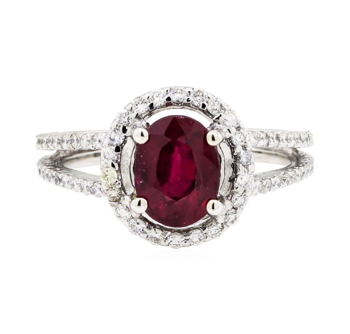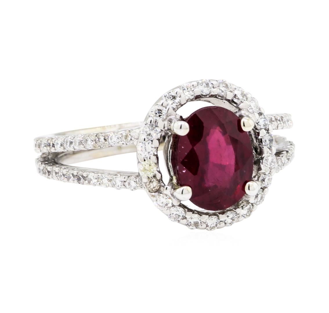 One electronically tested 18KT white gold lady's cast fashion ring with a split shank halo with a bright polish finish. The featured lady's ring has a shank measuring 2.35 millimeters wide. Identified with markings of '18K'. Condition is new, good workmanship. Containing: One prong set oval modified mixed cut natural ruby-glass composite, measuring 7.86 x 6.06 x 4.00mm, (depth est.) 5%. bulge factor, approximate weight of 1.74ct., clarity is heavily included, medium dark, very slightly brownish, orangy red color, (GIA oR 6/3), cut is good. Transmitting light somewhat diffusely, semi-transparent to translucent. Colored gemstones are presumed to have been subjected to commonly used enhancement processes. Graded in the setting. Twenty-Two prong set round brilliant cut diamonds, measuring 1.35 - 1.25 x 0.81mm (depth est.) approximate total weight of 22 Stones = 0.18ct. Graded in the setting. Color H - I Clarity SI-1 to SI-2 Cut Very Good Fifty-Two prong set round brilliant cut diamonds, measuring 1.20 - 1.10 x 0.71mm (depth est.) approximate total weight of 52 Stones = 0.30ct. Graded in the setting. Color H - I Clarity VS-2 to SI-1 Cut Very Good. Total Weight of Colored Stones 1.74ct.. Total Weight of Diamonds 0.48ct.. Total Weight of Ring 4.90gm. GAS Appraised.