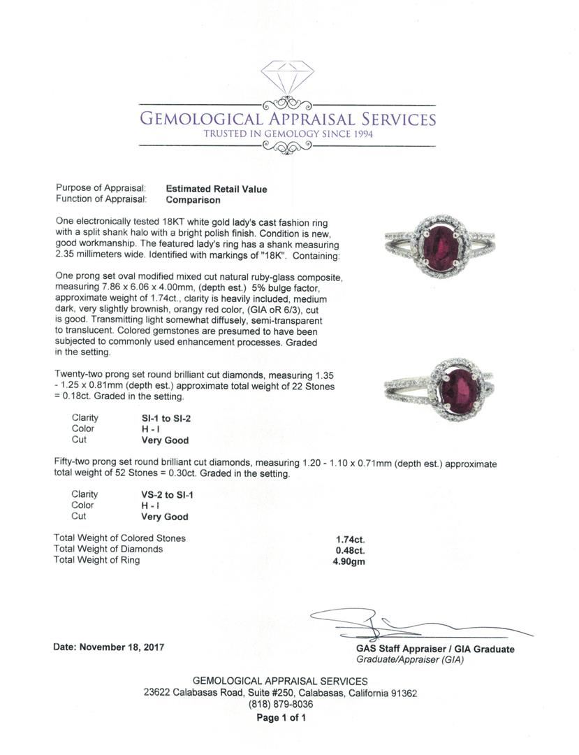 One electronically tested 18KT white gold lady's cast fashion ring with a split shank halo with a bright polish finish. The featured lady's ring has a shank measuring 2.35 millimeters wide. Identified with markings of '18K'. Condition is new, good workmanship. Containing: One prong set oval modified mixed cut natural ruby-glass composite, measuring 7.86 x 6.06 x 4.00mm, (depth est.) 5%. bulge factor, approximate weight of 1.74ct., clarity is heavily included, medium dark, very slightly brownish, orangy red color, (GIA oR 6/3), cut is good. Transmitting light somewhat diffusely, semi-transparent to translucent. Colored gemstones are presumed to have been subjected to commonly used enhancement processes. Graded in the setting. Twenty-Two prong set round brilliant cut diamonds, measuring 1.35 - 1.25 x 0.81mm (depth est.) approximate total weight of 22 Stones = 0.18ct. Graded in the setting. Color H - I Clarity SI-1 to SI-2 Cut Very Good Fifty-Two prong set round brilliant cut diamonds, measuring 1.20 - 1.10 x 0.71mm (depth est.) approximate total weight of 52 Stones = 0.30ct. Graded in the setting. Color H - I Clarity VS-2 to SI-1 Cut Very Good. Total Weight of Colored Stones 1.74ct.. Total Weight of Diamonds 0.48ct.. Total Weight of Ring 4.90gm. GAS Appraised.