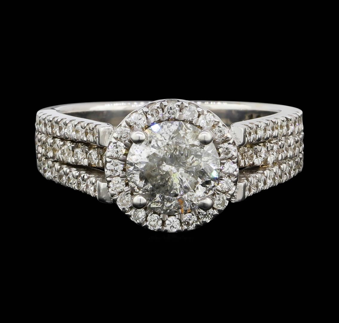 One electronically tested 18KT white gold lady's cast wedding ring with a split cathedral shank with a halo with a bright polish finish. The featured lady's ring has a shank measuring 3.34 millimeters wide. Identified with markings of "18K". Condition is new, good workmanship. Containing: One prong set round brilliant cut diamond, measuring 6.68 - 6.65 x 4.31mm (depth est.) , 3.00.%. GTCF approximate weight of 1.20ct. Graded in the setting. Clarity: I-1. Color: JCut Very Good Ninety-Six prong set round brilliant cut diamonds, measuring 1.20 - 1.10 x 0.71mm (depth est.) approximate total weight of 96 Stones = 0.55ct. Graded in the setting. Clarity: SI-1 to I-1. Color: H - ICut Good. Total Weight of Diamonds 1.75ct. Total Weight of Ring 6.60gm. GAS Appraised.