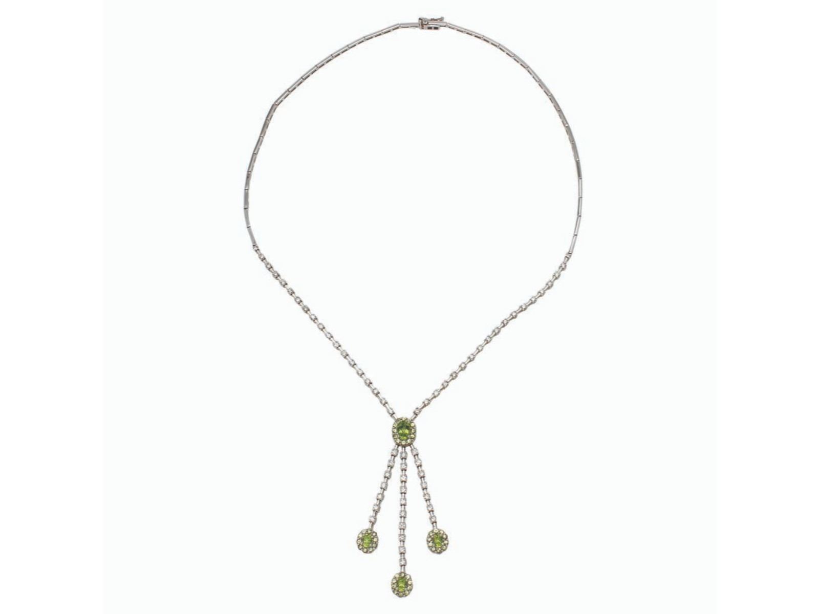 One 18KT White Gold 1.77ctw Peridot and Diamond Necklace. (46) Peridot stones with a total weight of 1.77cts. (62) Round Diamonds with a total weight of 1.44cts with a color of H and clarity of SI-1. Total weight of this necklace is 14.08 grams.
