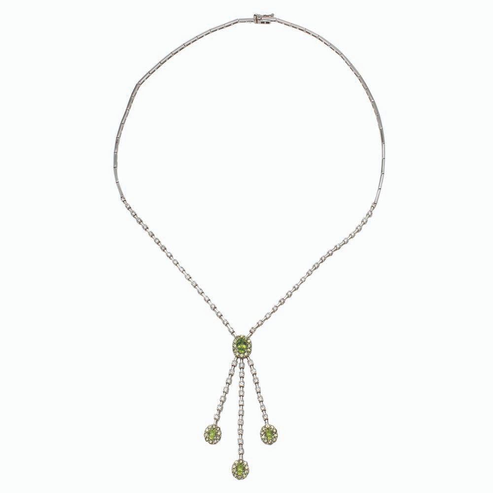 One 18KT White Gold 1.77ctw Peridot and Diamond Necklace. (46) Peridot stones with a total weight of 1.77cts. (62) Round Diamonds with a total weight of 1.44cts with a color of H and clarity of SI-1. Total weight of this necklace is 14.08 grams.