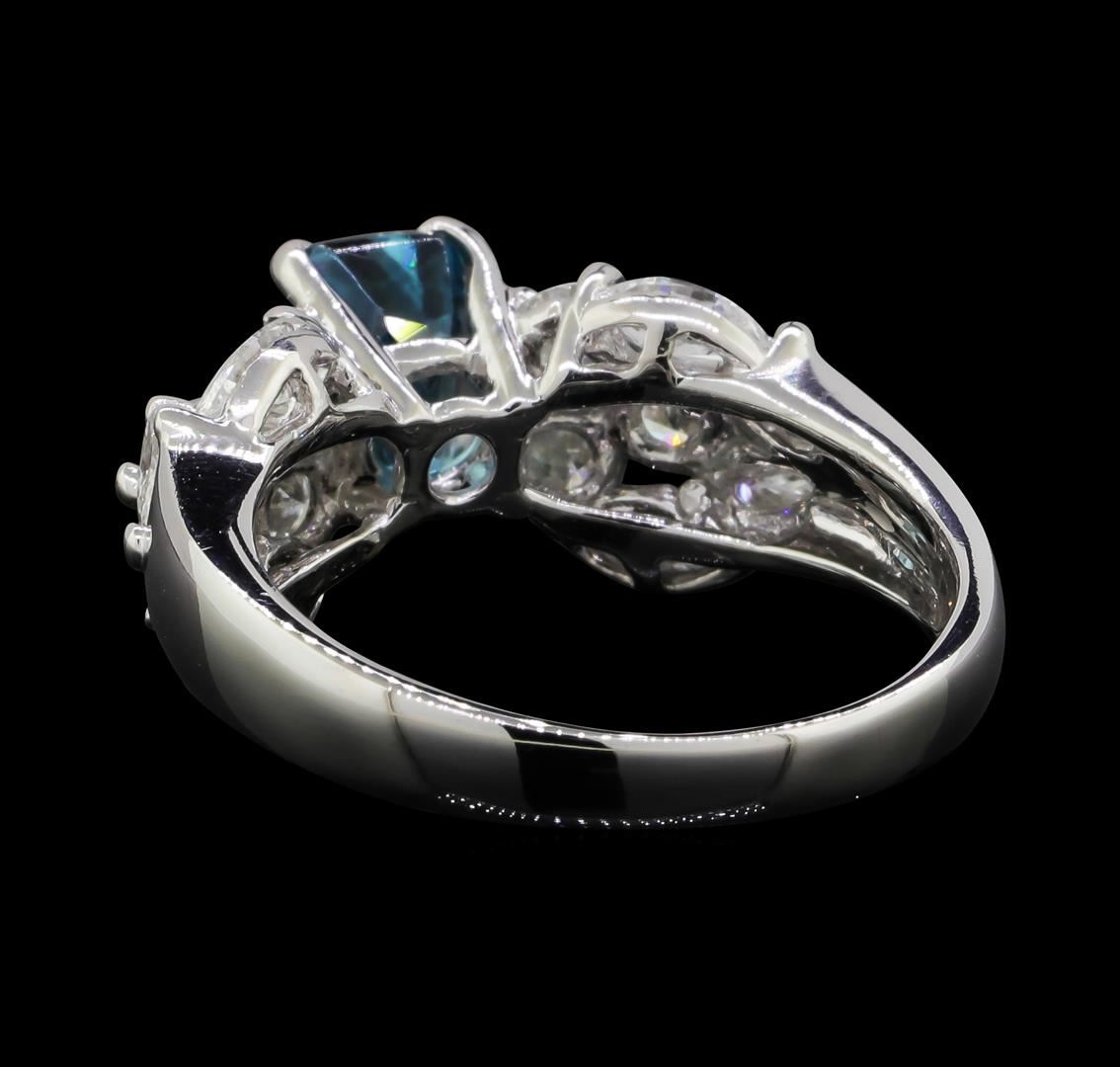 One electronically tested 18KT white gold lady's cast fashion ring with a tapered shank with a bright polish finish. The featured lady's ring has a bow motif top section and a shank measuring 2.50 millimeters wide. Identified with markings of "K18". Condition is new, good workmanship. Containing: One prong set rectangular modified brilliant cut natural blue zircon, measuring 6.88 x 4.65 x 4.31mm, (depth est.) approximate weight of 1.80ct., clarity is eye clean, medium, moderately strong, green blue color, (GIA GB 5/4), cut is good. Transmitting light with no distortion, transparent. Colored gemstones are presumed to have been subjected to commonly used enhancement processes. Graded in the setting. Two prong set round brilliant cut diamonds, measuring 3.35 - 3.30 x 2.07mm (depth est.) approximate total weight of 2 Stones = 0.28ct. Graded in the setting. Clarity: VS-2 to SI-1. Color: H - ICut Very Good Four prong set round brilliant cut diamonds, measuring 3.10 - 3.00 x 1.89mm (depth est.) approximate total weight of 4 Stones = 0.44ct. Graded in the setting. Clarity: VS-1 to VS-2. Color: H - ICut Very Good Four prong set marquise shaped cut diamonds, measuring 4.70 x 2.70 x 1.70mm (depth est.) approximate total weight of 4 Stones = 0.50ct. Graded in the setting. Clarity: SI-1 to SI-2. Color: G - HCut Good Four prong set marquise shaped cut diamonds, measuring 4.00 x 2.20 x 1.39mm (depth est.) approximate total weight of 4 Stones = 0.30ct. Graded in the setting. Clarity: SI-1 to SI-2. Color: H - ICut Good. Total Weight of Colored Stones 1.80ct. Total Weight of Diamonds 1.52ct. Total Weight of Ring 5.40gm. GAS Appraised.