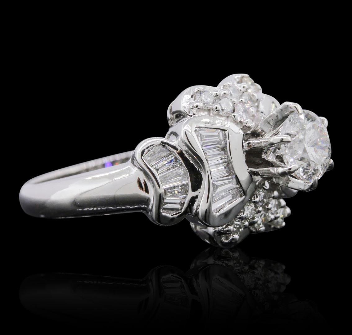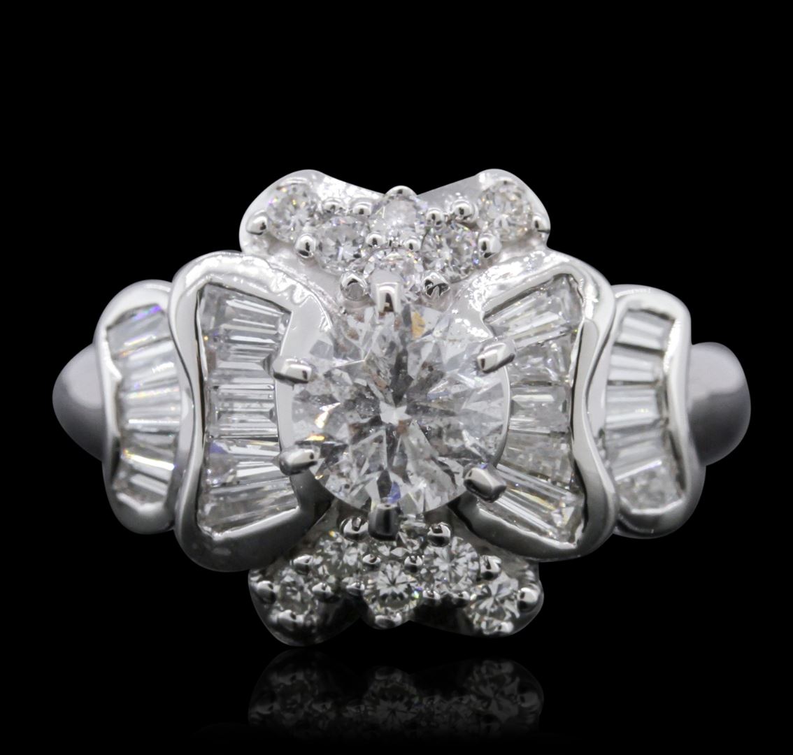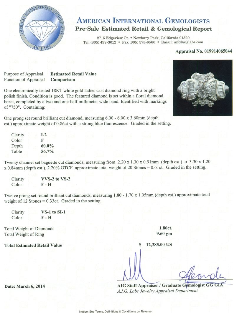 One electronically tested 18KT white gold ladies cast diamond ring with a bright polish finish. Condition is good. The featured diamond is set within a floral diamond bezel, completed by a two and one half millimeter wide band. Identified with markings of "750". Containing: One prong set round brilliant cut diamond, measuring 6.00 - 6.00 x 3.60mm (depth est.) approximate total weight of 0.86ct with a strong blue fluorescence. Graded in the setting. Clarity I-2. Color F. Depth 60.0%. Table 56.7%. Twenty channel set baguette cut diamonds, measuring from 2.20 x 1.30 x 0.91mm (depth est.) to 3.30 x 1.20 x 0.84mm (depth est.), 2.20% GTCF approximate total weight of 20 Stones = 0.61ct. Graded in the setting. Clarity VVS-2 to VS-2. Color F-H. Twelve prong set round brilliant cut diamonds, measuring 1.80 - 1.70 x 1.05mm (depth est.) approximate total weight of 12 Stones = 0.33ct. Graded in the setting. Clarity VS-1 to SI-1. Color F-H. Total Weight of Diamonds 1.80ct. Total Weight of Ring 9.60 grams. AIG Appraised at $12,385.00.
