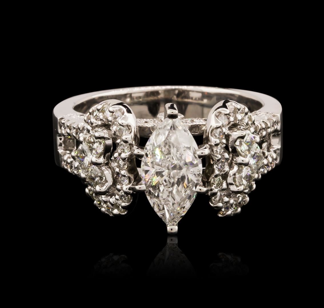 One electronically tested 18KT white gold ladies cast diamond engagement ring with a bright polish finish. Identified with markings of "18K". Condition is new. Containing: One prong set marquise shaped cut diamond, measuring 11.00 x 5.30 x 3.34mm (depth est.) approximate weight of 1.14ct. Clarity: I-2. Color: J, Cut is Good. Six prong set princess cut diamonds, measuring 2.20 x 2.20 x 1.65mm (depth est.) approximate total weight of 6 Stones = 0.39ct. Clarity: SI-1. Color: I - J, Cut is Good. Forty-Eight prong set round brilliant cut diamonds, measuring 1.20 - 1.20 x 0.72mm (depth est.) approximate total weight of 48 Stones = 0.30ct. Clarity: SI-2 to I-1. Color: I - J, Cut is Good. All diamonds are graded in the mounting, unless otherwise stated. Total Weight of Diamonds 1.83ct. Total Weight of Engagement Ring 9.40 grams. GGL Appraised at $8,710.00.