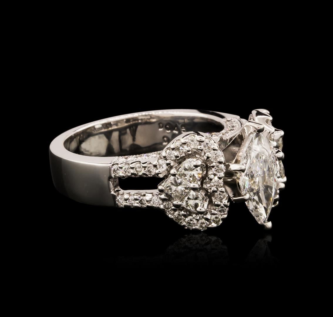 One electronically tested 18KT white gold ladies cast diamond engagement ring with a bright polish finish. Identified with markings of "18K". Condition is new. Containing: One prong set marquise shaped cut diamond, measuring 11.00 x 5.30 x 3.34mm (depth est.) approximate weight of 1.14ct. Clarity: I-2. Color: J, Cut is Good. Six prong set princess cut diamonds, measuring 2.20 x 2.20 x 1.65mm (depth est.) approximate total weight of 6 Stones = 0.39ct. Clarity: SI-1. Color: I - J, Cut is Good. Forty-Eight prong set round brilliant cut diamonds, measuring 1.20 - 1.20 x 0.72mm (depth est.) approximate total weight of 48 Stones = 0.30ct. Clarity: SI-2 to I-1. Color: I - J, Cut is Good. All diamonds are graded in the mounting, unless otherwise stated. Total Weight of Diamonds 1.83ct. Total Weight of Engagement Ring 9.40 grams. GGL Appraised at $8,710.00.