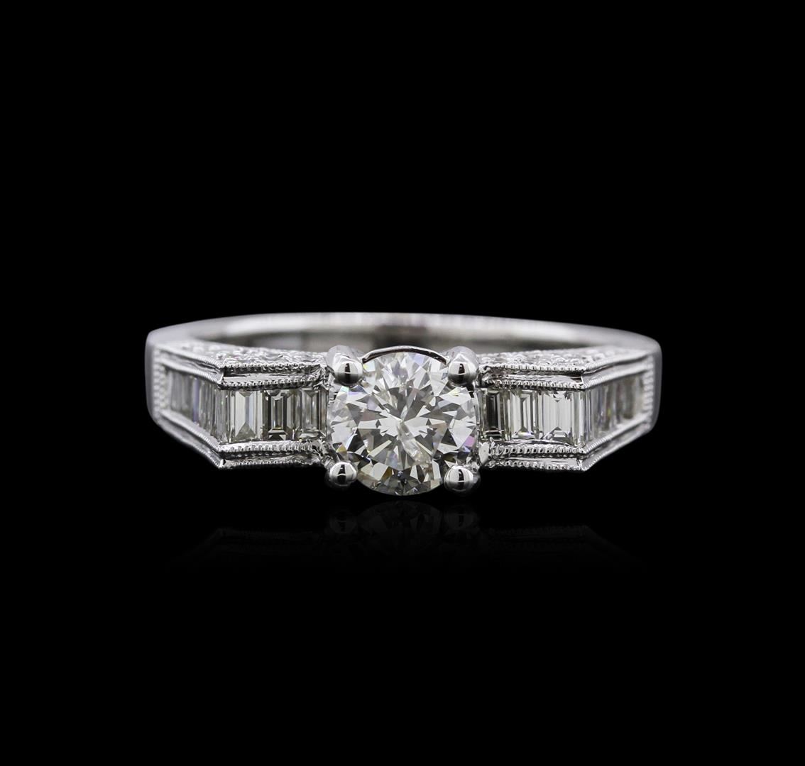 One electronically tested 18KT white gold ladies cast diamond engagement ring with a bright polish finish. Identified with markings of "18K". Condition is new. Containing: One prong set round brilliant cut diamond, measuring 5.80 - 5.80 x 3.62mm (depth est.) approximate weight of 0.74ct. Clarity: I-1. Color: K, Cut is Good. Twenty channel set baguette cut diamonds, measuring from 2.00 x 1.50 x 1.28mm (depth est.) to 2.30 x 1.50 x 1.28mm (depth est.) approximate total weight of 20 Stones = 0.75ct. Clarity: VS-1 to VS-2. Color: I - J, Cut is Good. Forty-Four prong set round brilliant cut diamonds, measuring 1.30 - 1.30 x 0.78mm (depth est.) approximate total weight of 44 Stones = 0.35ct. Clarity: SI-1. Color: H - I, Cut is Good. All diamonds are graded in the mounting, unless otherwise stated. Total Weight of Diamonds 1.85ct. Total Weight of Engagement Ring 5.80 grams. GGL Appraised at $7,115.00.