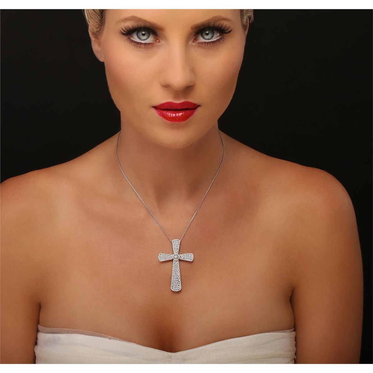 One electronically tested 18KT white gold ladies cast & assembled diamond "Cross" pendant with chain. Condition is new, good workmanship. The diamond "cross" pendant is supported by a sixteen inch length 18KT white gold designer style chain terminating in a lobster claw clasp. Area measurements of the pedant is 50.00 mm length and 35.00 mm width. Bright polish finish. Identified with markings of "750". Containing: One Hundred Thirteen channel set round brilliant cut diamonds, measuring 1.60 - 1.10 x 0.81mm (depth est.) approximate. Total Weight of 113 Stones = 1.13ct. Graded in the setting. Clarity: VVS-2 to VS-2. Color: F - H Three Hundred Sixty-One prong set round brilliant cut diamonds, measuring 0.80 - 0.80 x 0.48mm (depth est.) approximate. Total Weight of 361 Stones = 0.75ct. Graded in the setting. Clarity: VVS-2 to VS-2. Color: F - H. Total Weight of Diamonds 1.88ct. Total Weight of Pendant With Chain 12.40 grams. AIG Appraised at $12,465.00.