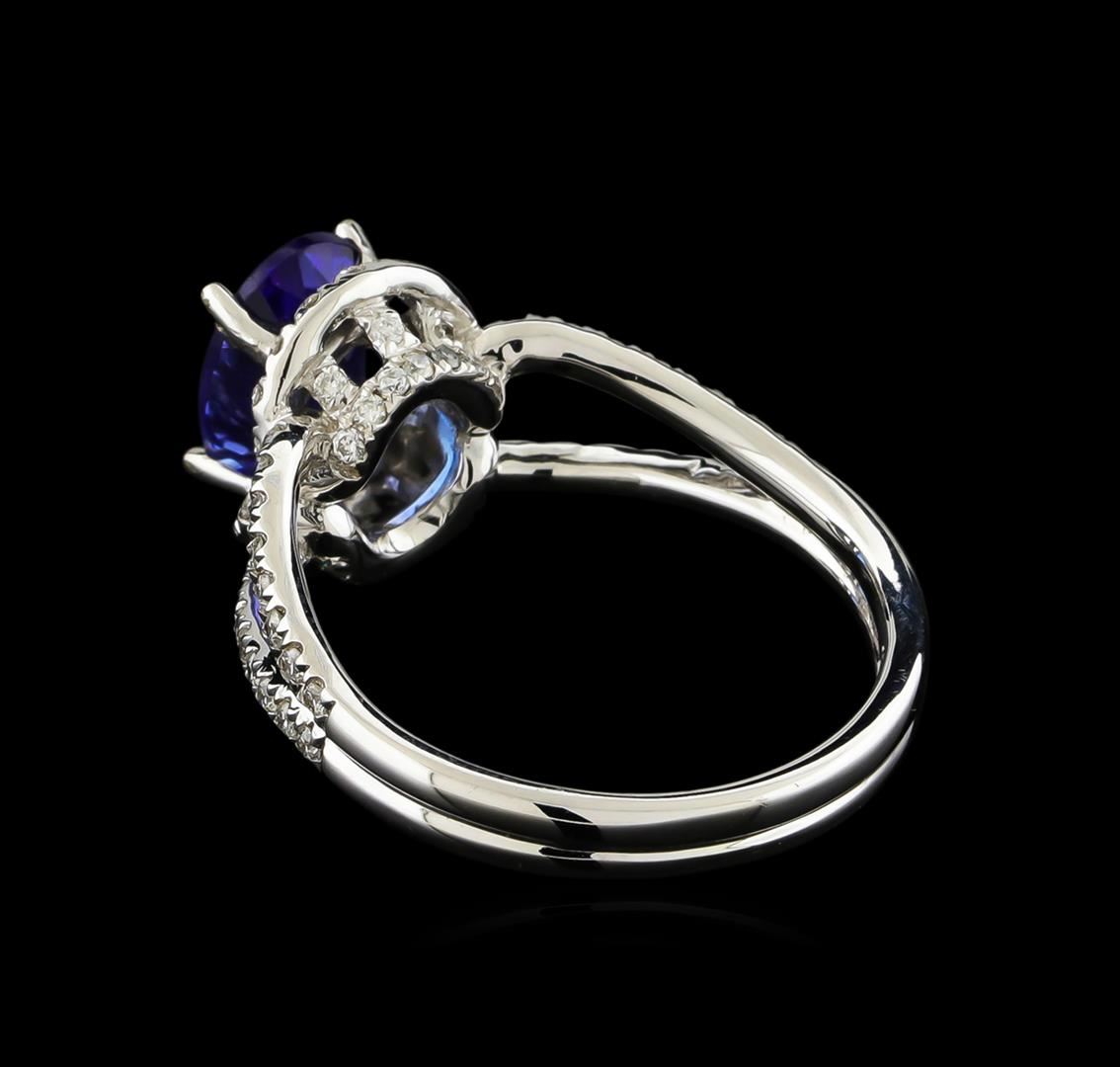 One electronically tested 18KT white gold ladies combination cast & assembled prong set ring with a split shoulder shank with a bright polish finish. Identified with markings of "750". Condition is new. Containing: One prong set oval modified brilliant cut natural tanzanite, measuring 9.06 x 6.48 x 4.76mm, approximate weight of 1.93ct., clarity is eye clean, type I, medium, moderately strong, bluish violet color, (GIA bV 5/4), cut is good. Seventy prong set round brilliant cut diamonds, measuring 1.10 - 1.10 x 0.66mm (depth est.) approximate total weight of 70 Stones = 0.49ct. Clarity: SI-2 to I-1. Color: H - I, Cut is Good. All diamonds and colored gemstones are graded in the mounting, unless otherwise stated, Colored gemstones are presumed to have been subjected to commonly used enhancement processes. Total Weight of Colored Stones 1.93ct. Total Weight of Diamonds 0.49ct. Total Weight of Ring 4.80 grams. GGL Appraised at $6,450.00.