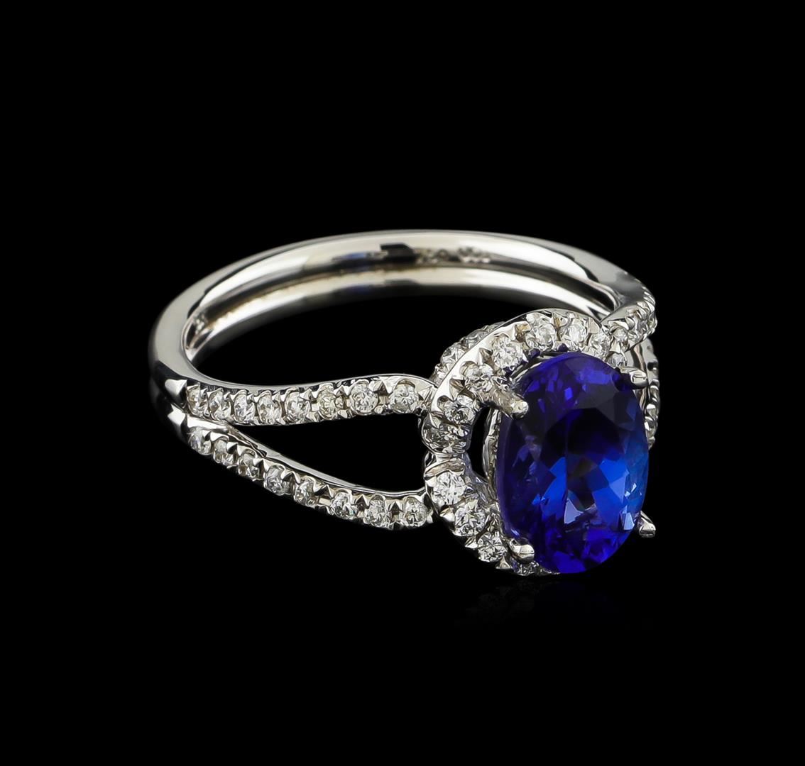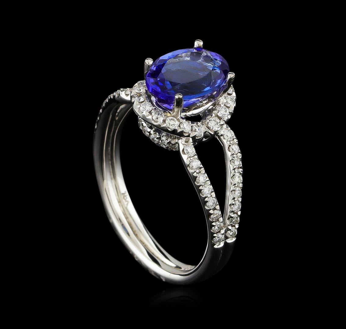One electronically tested 18KT white gold ladies combination cast & assembled prong set ring with a split shoulder shank with a bright polish finish. Identified with markings of "750". Condition is new. Containing: One prong set oval modified brilliant cut natural tanzanite, measuring 9.06 x 6.48 x 4.76mm, approximate weight of 1.93ct., clarity is eye clean, type I, medium, moderately strong, bluish violet color, (GIA bV 5/4), cut is good. Seventy prong set round brilliant cut diamonds, measuring 1.10 - 1.10 x 0.66mm (depth est.) approximate total weight of 70 Stones = 0.49ct. Clarity: SI-2 to I-1. Color: H - I, Cut is Good. All diamonds and colored gemstones are graded in the mounting, unless otherwise stated, Colored gemstones are presumed to have been subjected to commonly used enhancement processes. Total Weight of Colored Stones 1.93ct. Total Weight of Diamonds 0.49ct. Total Weight of Ring 4.80 grams. GGL Appraised at $6,450.00.