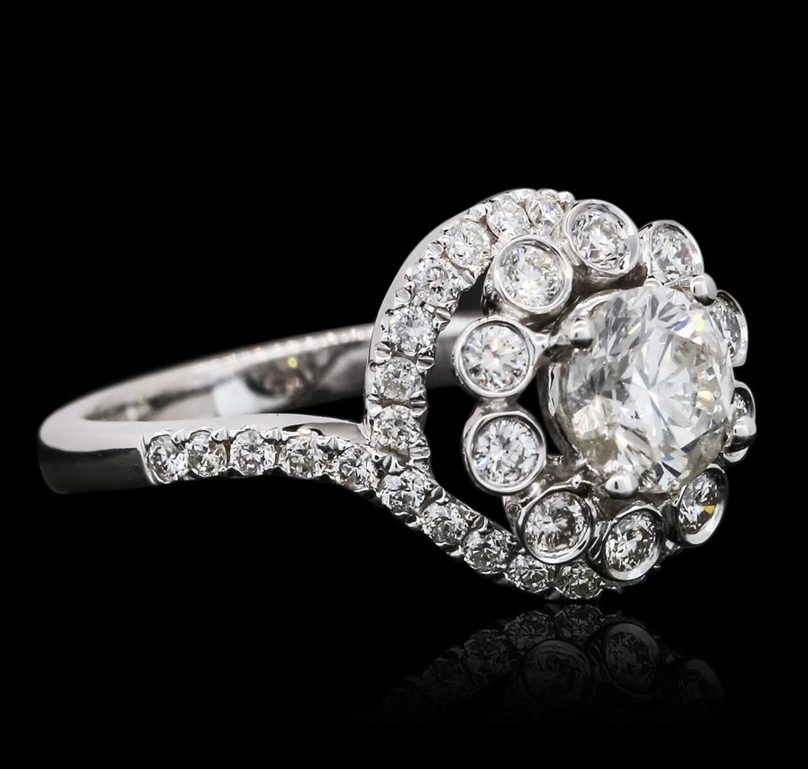 One electronically tested 18KT white gold ladies cast diamond unity ring with a bright polish finish. The featured diamond is set within a diamond bezel supported by mirroring diamond ribbons, completed by a two and one-half millimeter wide band. Identified with markings of "18K 750". Condition is new, good workmanship. Containing: One prong set round brilliant cut diamond, measuring 6.20 - 6.20 x 4.00mm (depth est.) approximate weight of 1.04ct. Graded in the setting. Clarity: I-1. Color: J. Depth 64.5%. Table 59.7%. Ten bezel set round brilliant cut diamonds, measuring 2.10 - 2.00 x 1.23mm (depth est.) approximate total weight of 10 Stones = 0.41ct. Graded in the setting. Clarity: SI-1 to SI-2. Color: G - I Thirty-Two prong set round brilliant cut diamonds, measuring 1.60 - 1.50 x 0.93mm (depth est.) approximate total weight of 32 Stones = 0.53ct. Graded in the setting. Clarity: SI-1 to SI-2. Color: G - I. Total Weight of Diamonds 1.98ct. Total Weight of Ring 5.43 grams. AIG Appraised at $17,130.00.