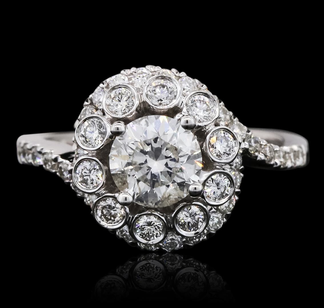 One electronically tested 18KT white gold ladies cast diamond unity ring with a bright polish finish. The featured diamond is set within a diamond bezel supported by mirroring diamond ribbons, completed by a two and one-half millimeter wide band. Identified with markings of "18K 750". Condition is new, good workmanship. Containing: One prong set round brilliant cut diamond, measuring 6.20 - 6.20 x 4.00mm (depth est.) approximate weight of 1.04ct. Graded in the setting. Clarity: I-1. Color: J. Depth 64.5%. Table 59.7%. Ten bezel set round brilliant cut diamonds, measuring 2.10 - 2.00 x 1.23mm (depth est.) approximate total weight of 10 Stones = 0.41ct. Graded in the setting. Clarity: SI-1 to SI-2. Color: G - I Thirty-Two prong set round brilliant cut diamonds, measuring 1.60 - 1.50 x 0.93mm (depth est.) approximate total weight of 32 Stones = 0.53ct. Graded in the setting. Clarity: SI-1 to SI-2. Color: G - I. Total Weight of Diamonds 1.98ct. Total Weight of Ring 5.43 grams. AIG Appraised at $17,130.00.