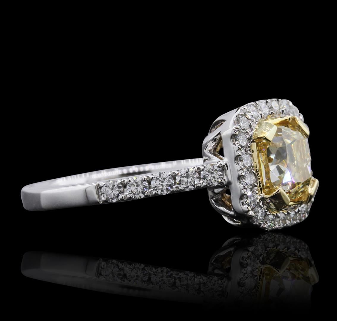 One electronically tested 18KT white gold ladies cast diamond ring with a bright polish finish. Condition is new, good workmanship. The featured diamond is mounted in a yellow gold accented basket, set within a diamond bezel, supported by diamond set shoulders and completed by a two millimeter wide band. Trademark is DAYANII. Identified with markings of "18K 750". Containing: One prong set cushion cut diamond, measuring 6.00 x 5.85 x 3.63mm (depth est.), 8.00% GTCF approximate weight of 1.35ct. Graded in the setting. Clarity SI-2 Depth 62.1%Table 58.1% Thirty prong set round brilliant cut diamonds, measuring 1.90 - 1.50 x 1.02mm (depth est.) approximate total weight of 30 Stones = 0.63ct. Graded in the setting. Clarity SI-1 to I-1 Color F - H Total Weight of Diamonds 1.98ct. Total Weight of Ring 5.50 grams. AIG Appraised at $11,945.00.