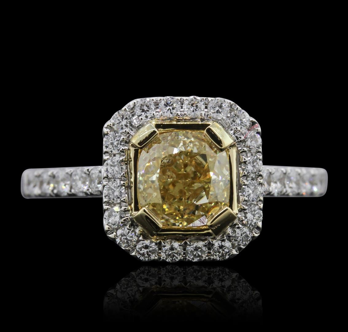 One electronically tested 18KT white gold ladies cast diamond ring with a bright polish finish. Condition is new, good workmanship. The featured diamond is mounted in a yellow gold accented basket, set within a diamond bezel, supported by diamond set shoulders and completed by a two millimeter wide band. Trademark is DAYANII. Identified with markings of "18K 750". Containing: One prong set cushion cut diamond, measuring 6.00 x 5.85 x 3.63mm (depth est.), 8.00% GTCF approximate weight of 1.35ct. Graded in the setting. Clarity SI-2 Depth 62.1%Table 58.1% Thirty prong set round brilliant cut diamonds, measuring 1.90 - 1.50 x 1.02mm (depth est.) approximate total weight of 30 Stones = 0.63ct. Graded in the setting. Clarity SI-1 to I-1 Color F - H Total Weight of Diamonds 1.98ct. Total Weight of Ring 5.50 grams. AIG Appraised at $11,945.00.