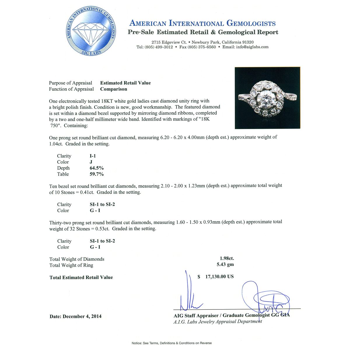 One electronically tested 18KT white gold ladies cast diamond unity ring with a bright polish finish. The featured diamond is set within a diamond bezel supported by mirroring diamond ribbons, completed by a two and one-half millimeter wide band. Identified with markings of "18K 750". Condition is new, good workmanship. Containing: One prong set round brilliant cut diamond, measuring 6.20 - 6.20 x 4.00mm (depth est.) approximate weight of 1.04ct. Graded in the setting. Clarity: I-1. Color: J. Depth 64.5%. Table 59.7%. Ten bezel set round brilliant cut diamonds, measuring 2.10 - 2.00 x 1.23mm (depth est.) approximate total weight of 10 Stones = 0.41ct. Graded in the setting. Clarity: SI-1 to SI-2. Color: G - I Thirty-Two prong set round brilliant cut diamonds, measuring 1.60 - 1.50 x 0.93mm (depth est.) approximate total weight of 32 Stones = 0.53ct. Graded in the setting. Clarity: SI-1 to SI-2. Color: G - I. Total Weight of Diamonds 1.98ct. Total Weight of Ring 5.43 grams. AIG Appraised at $17,130.00.
